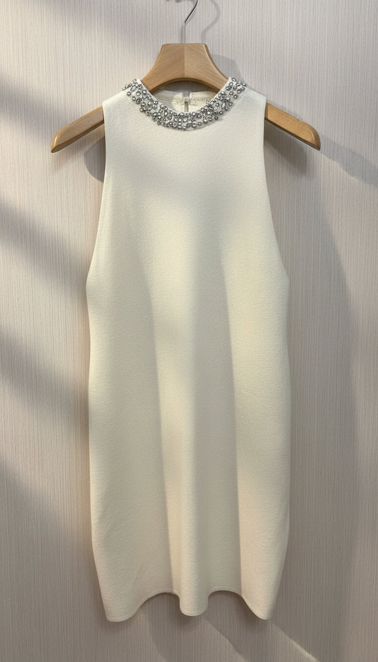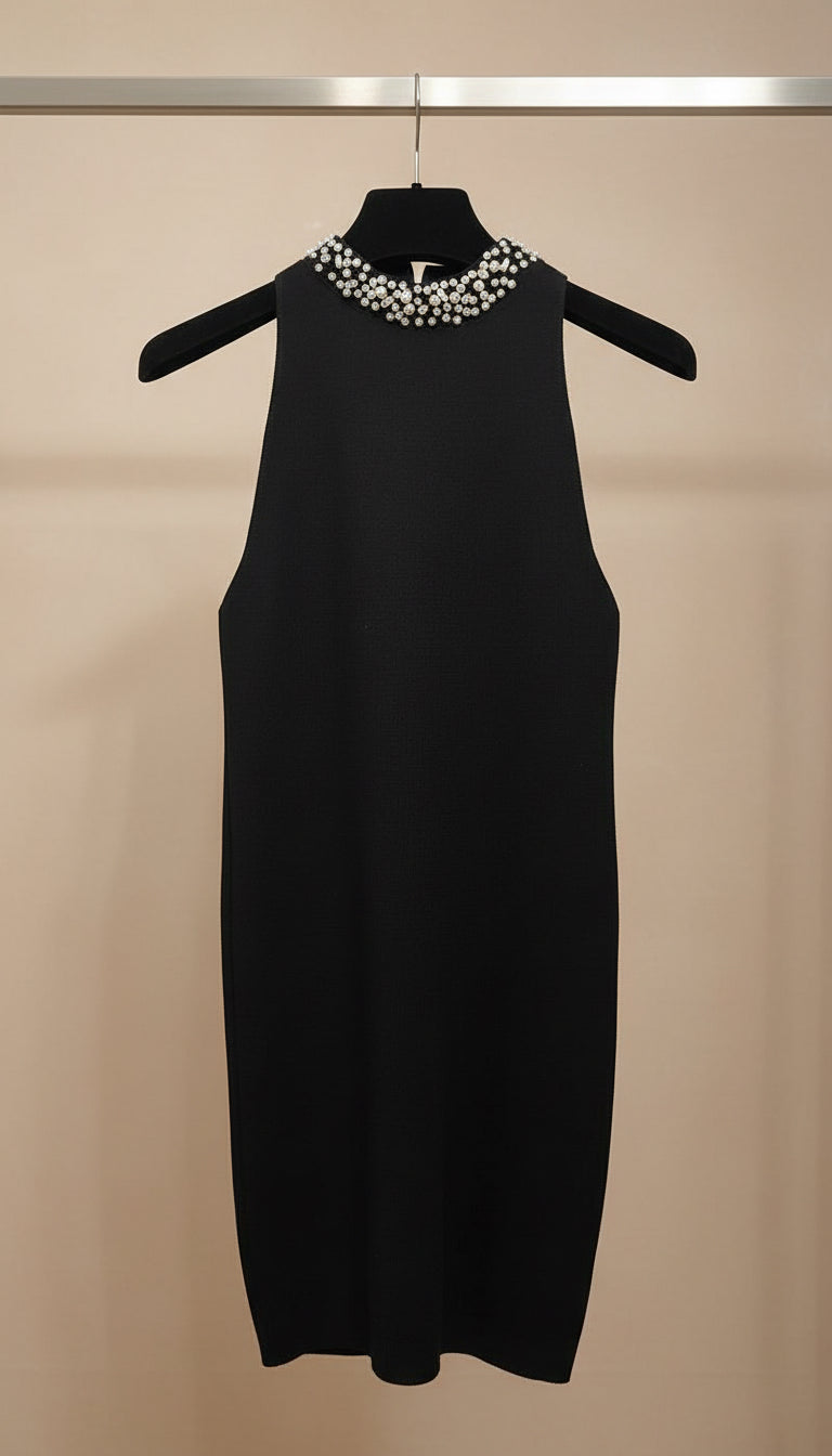 Elegante abito in viscosa che cattura la luce con raffinati dettagli in strass sul giro collo. La silhouette elasticizzata abbraccia il corpo con comfort naturale, garantendo libertà di movimento senza compromessi sulla forma. Perfetto per occasioni speciali o per elevare il tuo stile quotidiano con un tocco di sofisticazione. Un capo versatile che unisce lusso e praticità.