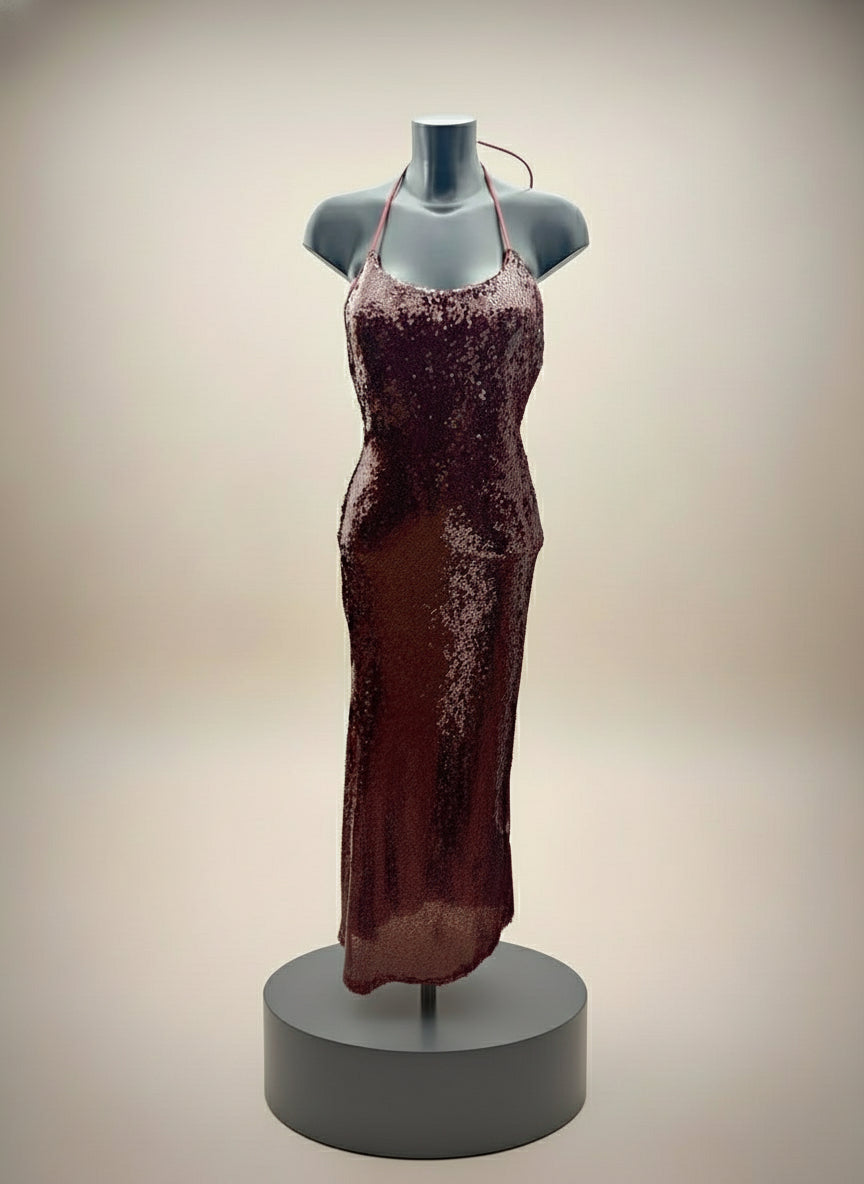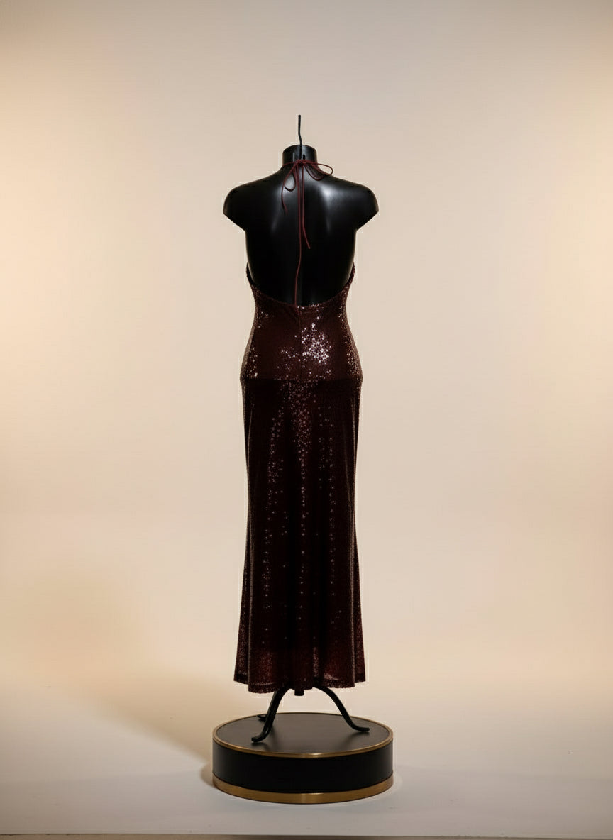 Abito lungo in paillettes che cattura la luce con ogni movimento. Foderato per un comfort impeccabile e una silhouette raffinata. Il laccetto regolabile al collo ti permette di personalizzare lo scollo secondo il tuo stile, passando da un'eleganza sobria a un'audacia sofisticata. Perfetto per serate speciali dove desideri brillare con classe e distinzione.