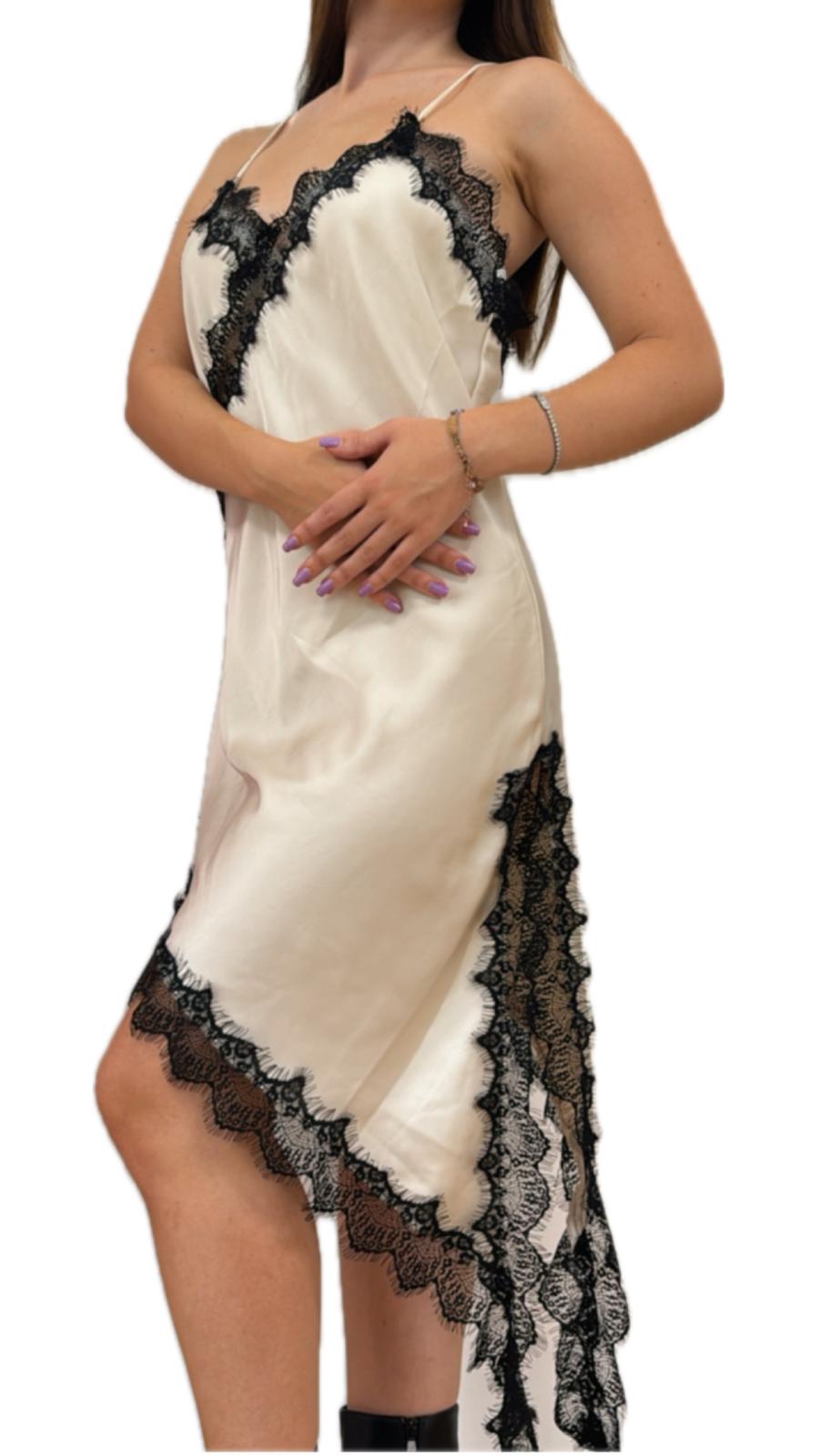 Questo abito combina l’eleganza del pizzo con la lucentezza raffinata del raso, creando un capo ideale per occasioni speciali. La qualità dei materiali garantisce una vestibilità confortevole e un effetto visivo sofisticato, perfetto per chi cerca stile e classe in un solo abito.
