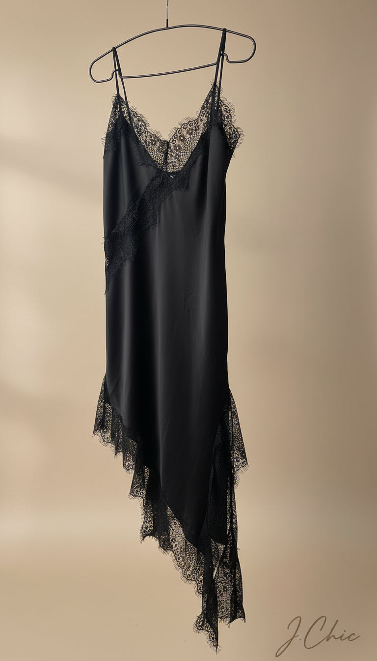 Eleganza sofisticata in ogni dettaglio. Questo abito in raso combina la fluidità lussuosa del tessuto con inserti in pizzo delicato, creando un contrasto affascinante tra morbidezza e struttura. Lo spacco laterale aggiunge movimento e sensualità, permettendoti di muoverti con grazia e sicurezza. Perfetto per occasioni speciali che richiedono un tocco di raffinatezza contemporanea, questo pezzo cattura l'essenza del lusso minimalista che caratterizza J.Chic.