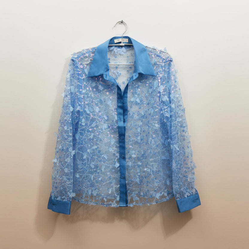 Camicia elegante che unisce tulle trasparente e raso lucido in una composizione sofisticata. Farfalle e paillettes in rilievo catturano la luce con movimento delicato, mentre i polsi e il collo in raso a contrasto definiscono la silhouette con precisione. Un capo che trasforma ogni occasione in un momento di pura eleganza, perfetto per chi ricerca dettagli artigianali e tessuti di qualità.