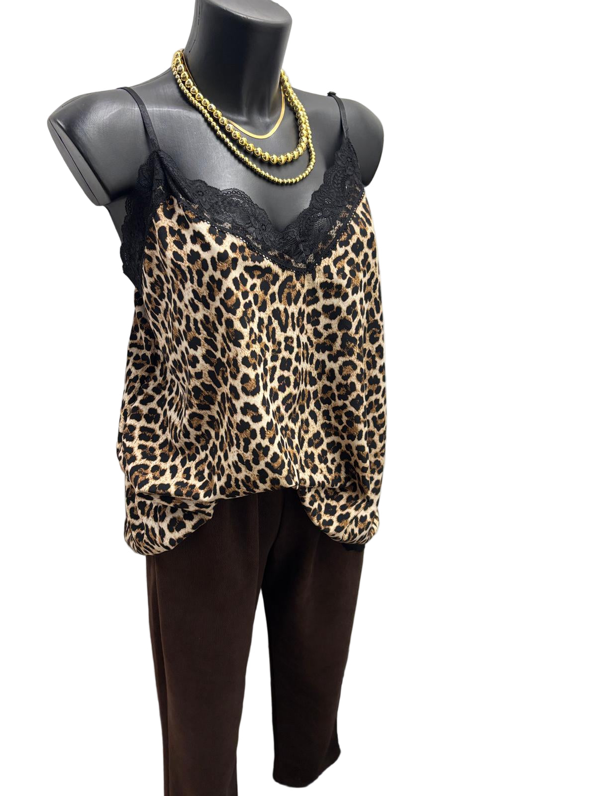 Questa canotta maculata in raso presenta una vestibilità over che garantisce comfort e stile contemporaneo. Dotata di profili in pizzo raffinati e spalline regolabili, unisce eleganza e praticità, permettendo una personalizzazione perfetta della vestibilità. Ideale per chi cerca un capo versatile e distintivo nel guardaroba.