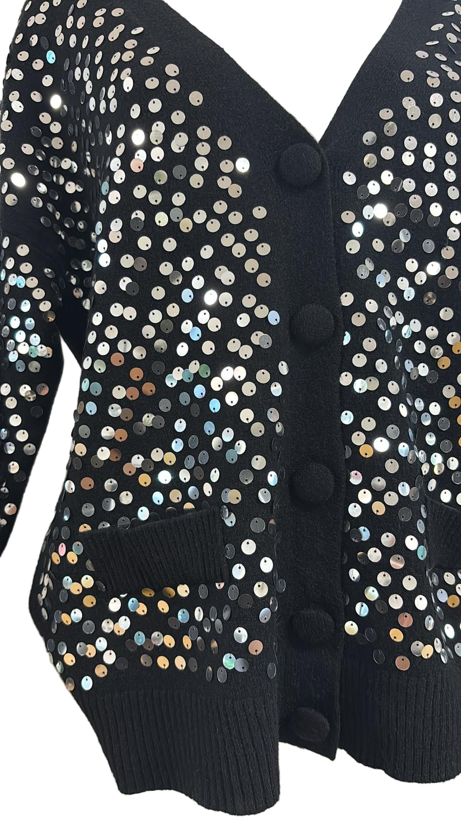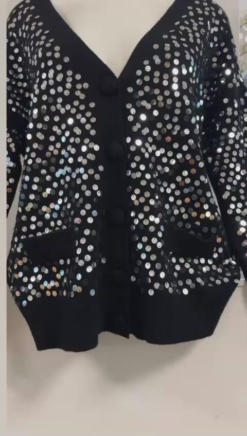 Questo cardigan over è arricchito da paillettes argentate che donano un tocco luminoso e raffinato al capo. La vestibilità ampia garantisce comfort e libertà di movimento, mentre il tessuto morbidissimo assicura una sensazione piacevole sulla pelle. Ideale per chi desidera unire eleganza e praticità in un solo capo versatile.