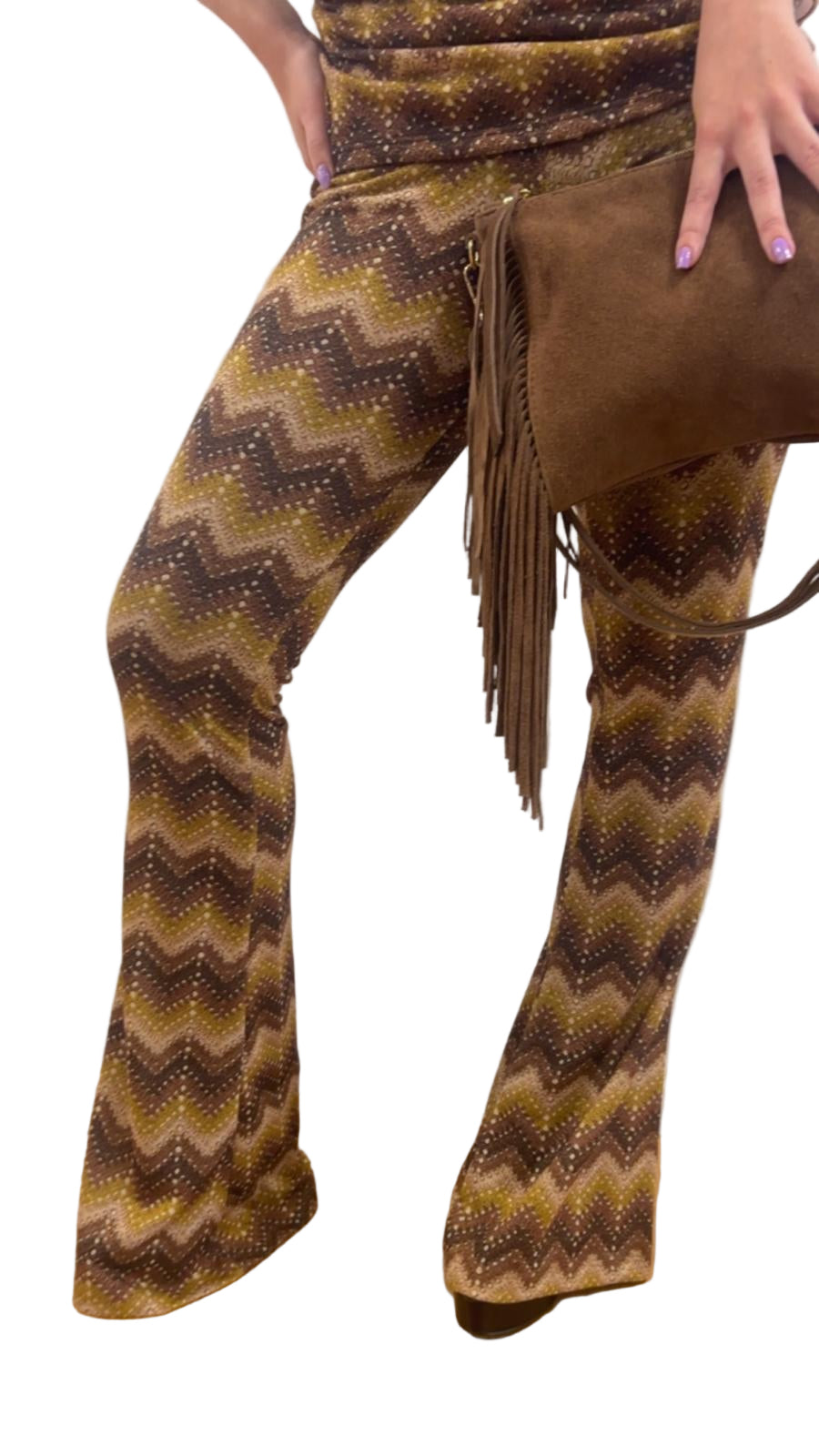 Questo completo elasticizzato con pantalone a zampa presenta una stampa ispirata a Missoni, nota per i suoi motivi unici e colorati. Realizzato con tessuti elasticizzati, garantisce comfort e libertà di movimento, mentre la linea a zampa valorizza la figura aggiungendo un tocco di eleganza retrò. Ideale per chi cerca un look raffinato e distintivo senza rinunciare alla praticità.