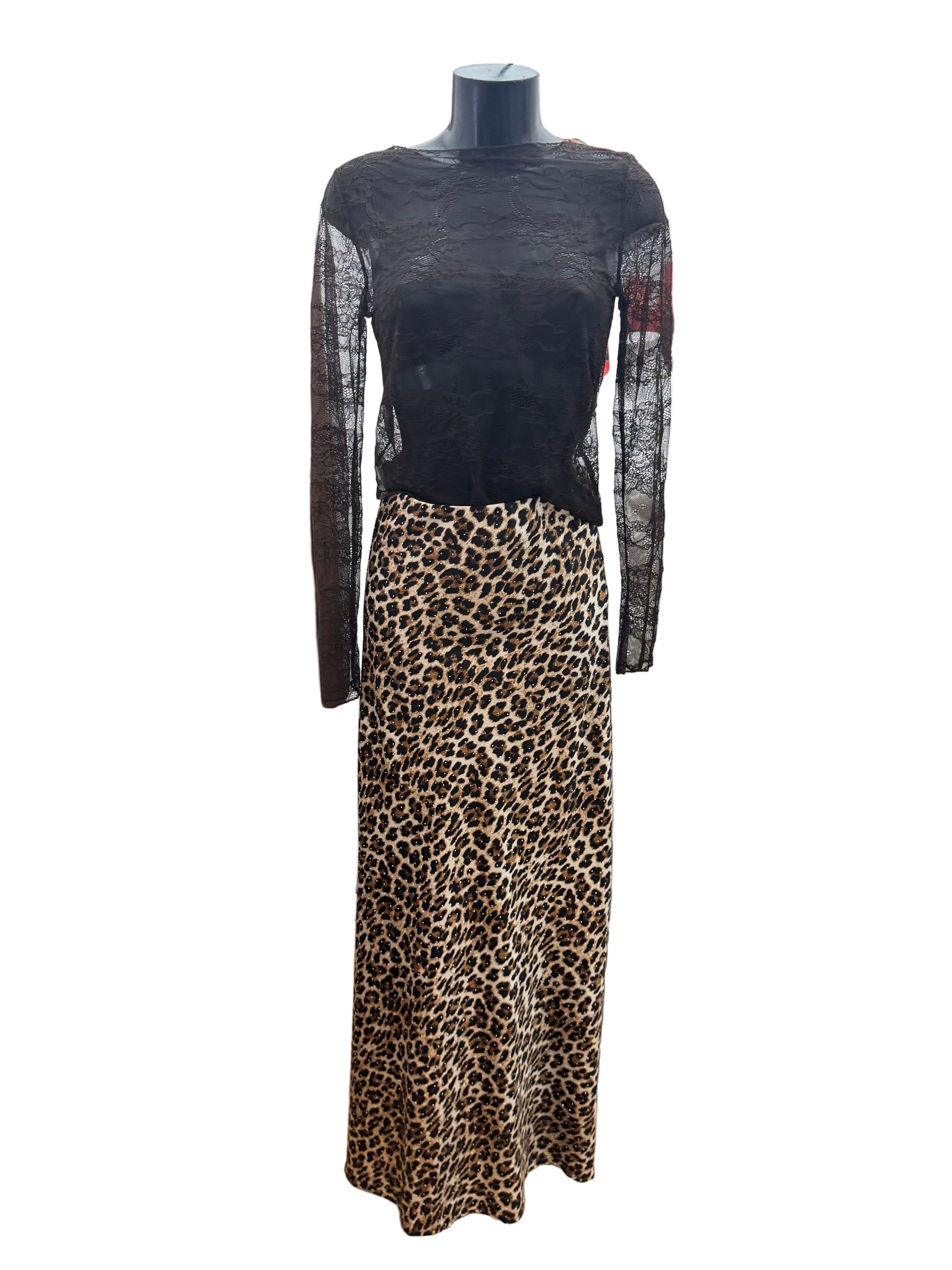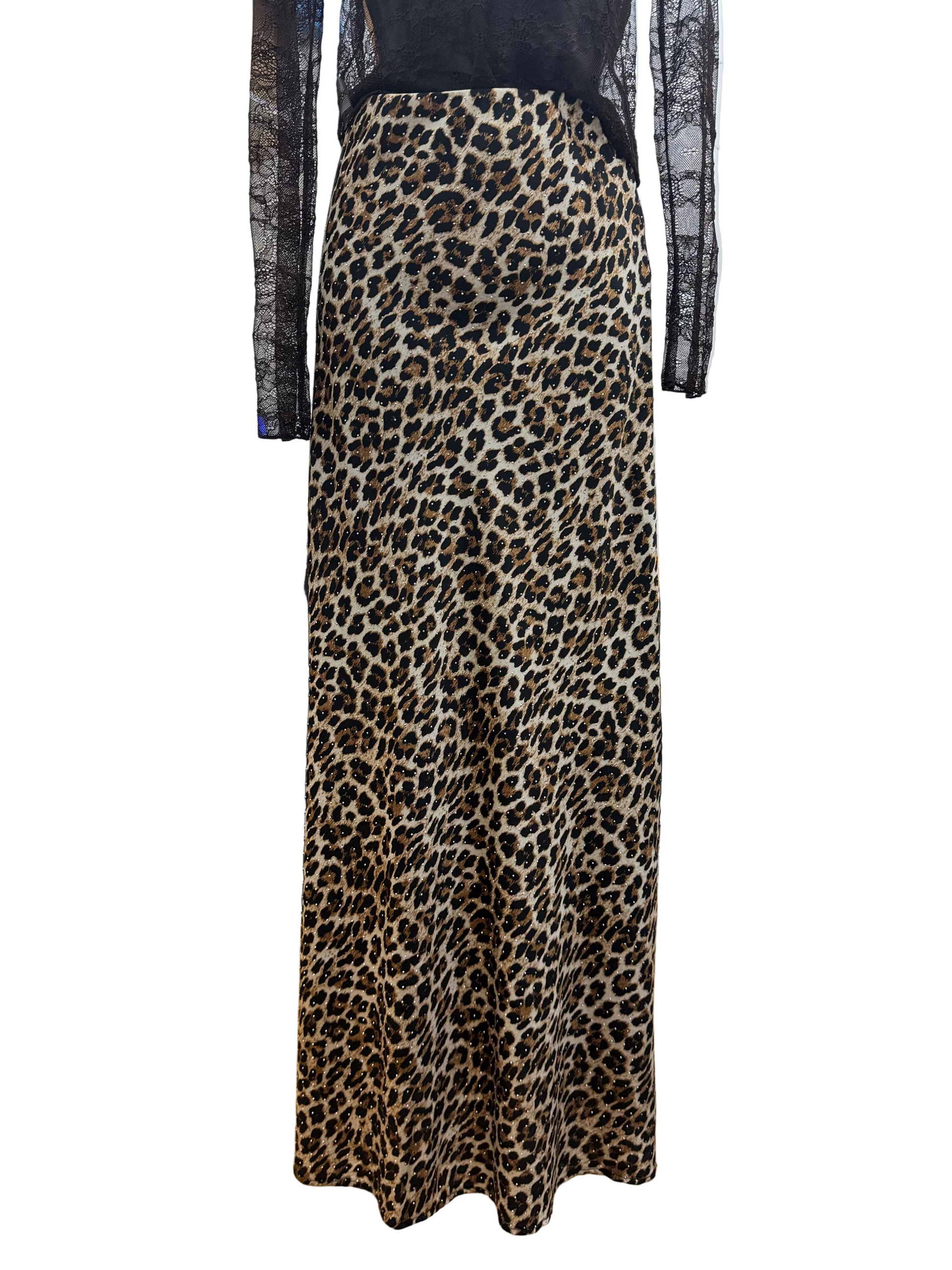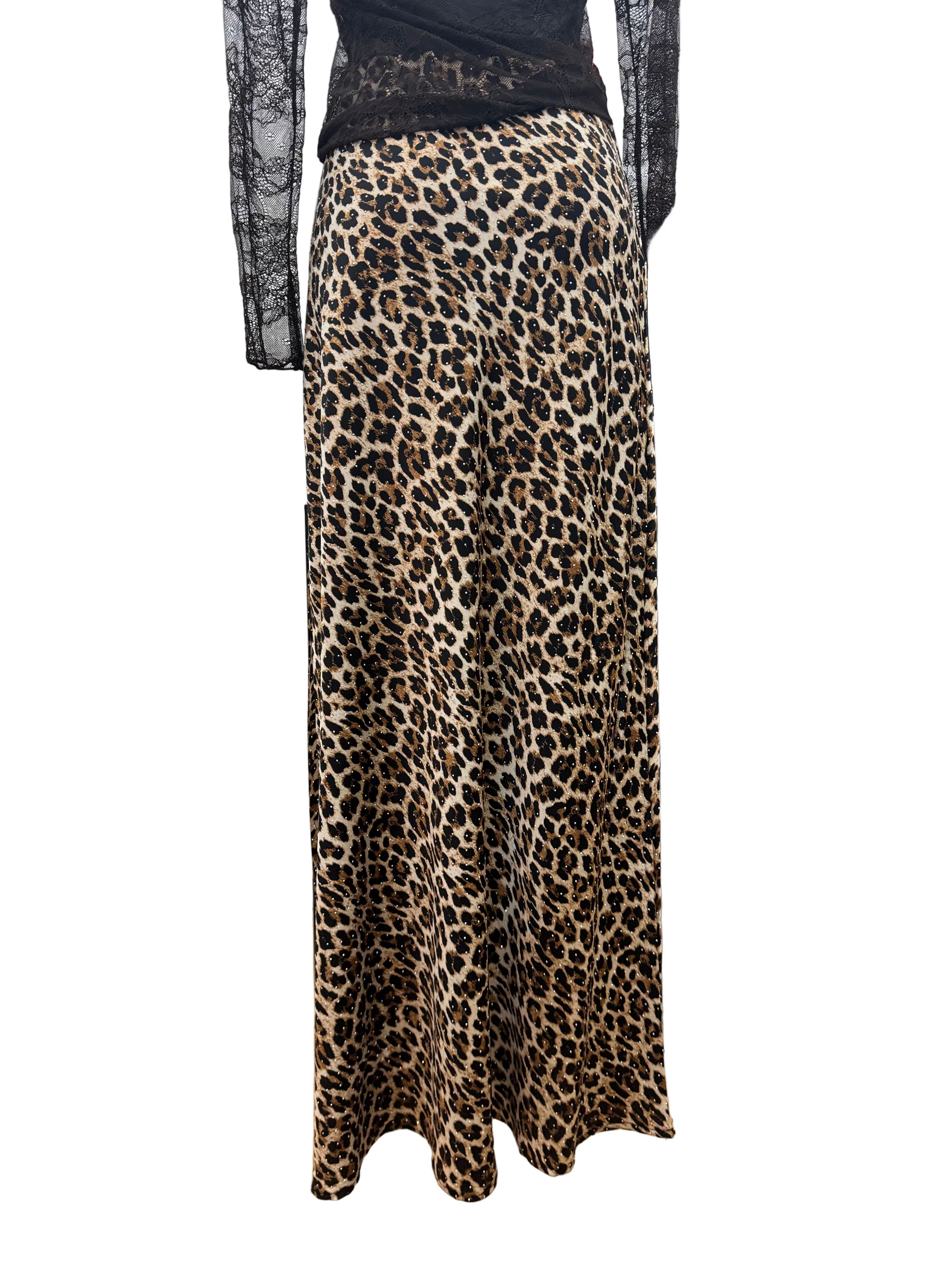 Questa gonna in raso con stampa leopardata adornata con strass scintillanti combina uno stile audace con un'eleganza raffinata. Il tessuto di raso liscio offre una sensazione lussuosa e un drappeggio lusinghiero, mentre gli accenti di strass aggiungono un luccichio sottile ma sofisticato. Perfetta per elevare sia gli abiti da giorno che da sera, questa gonna porta un tocco sicuro al tuo guardaroba con maestria professionale e attenzione ai dettagli.