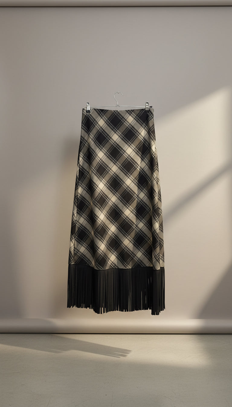 Questa gonna a scacchi incarna eleganza senza compromessi. Le frange in eco renna conferiscono movimento e carattere a ogni indossata. Il pattern geometrico classico si adatta facilmente a diversi stili personali, dal casual al sofisticato. Scegli un capo che rispecchia i tuoi valori e la tua ricerca di qualità premium, combinando consapevolezza ambientale con un design che non passa inosservato.