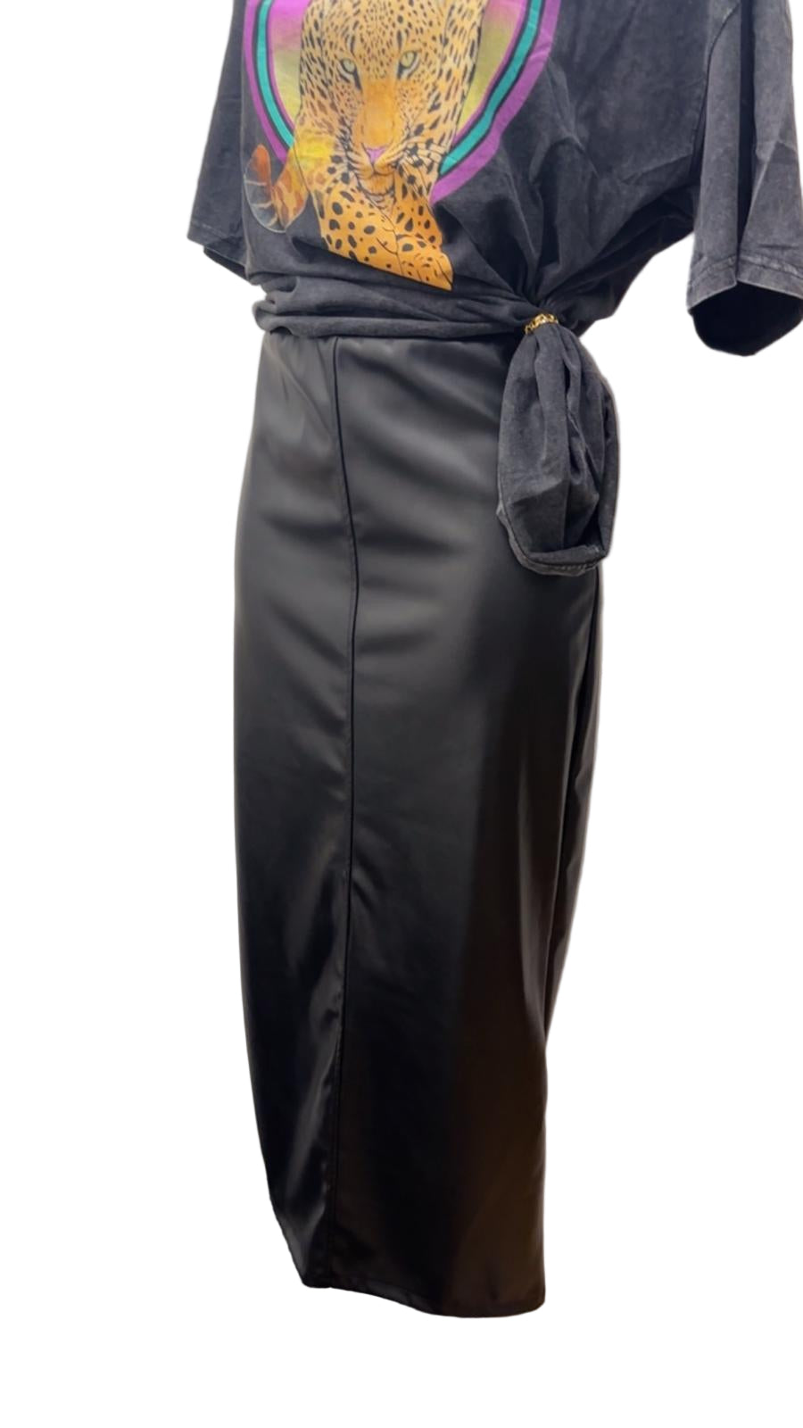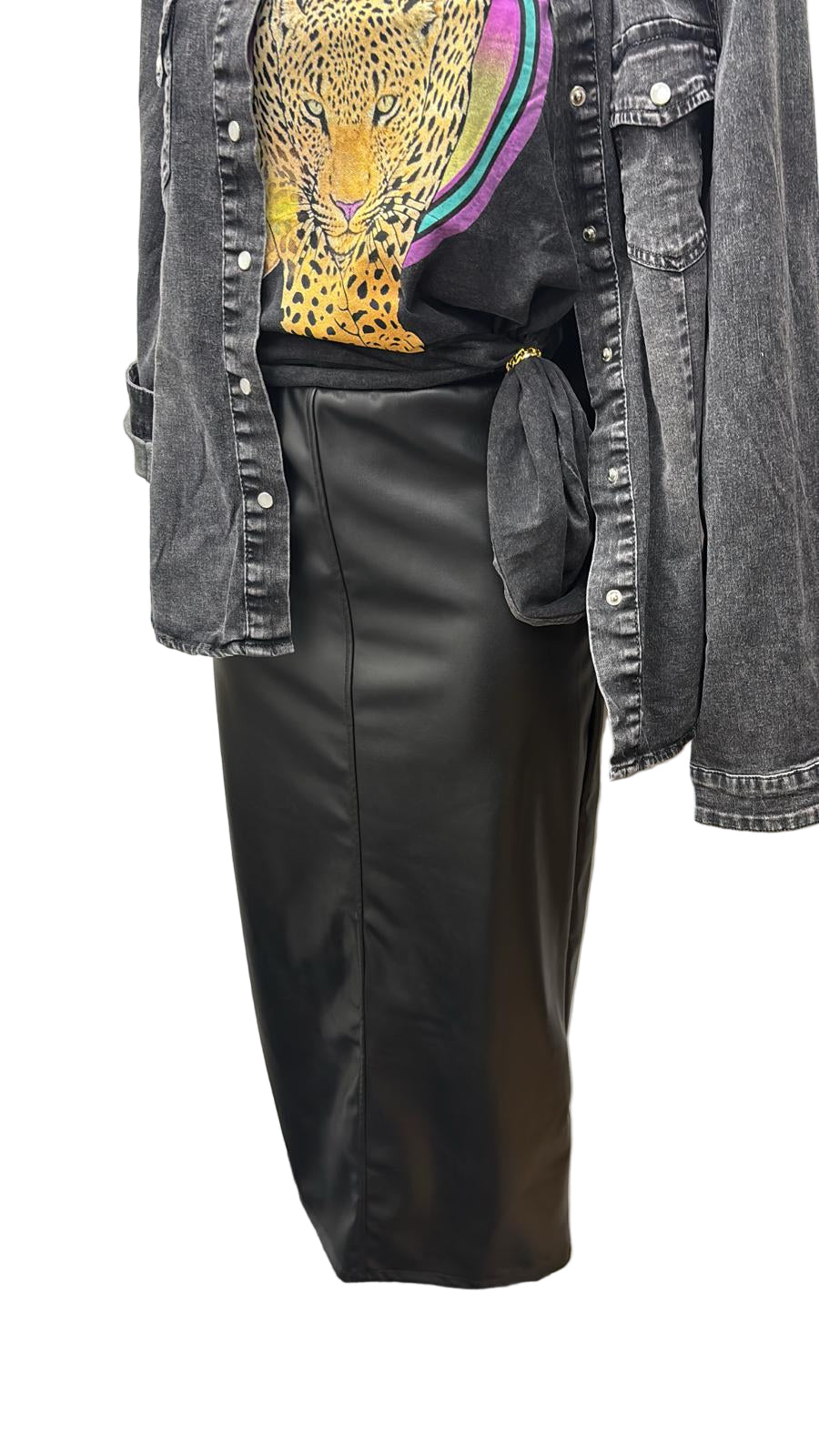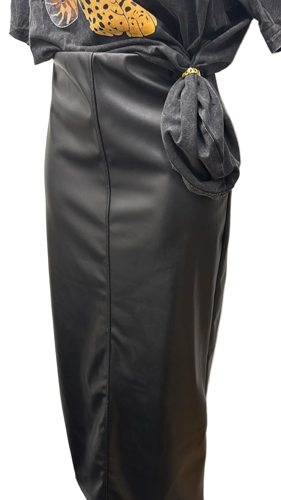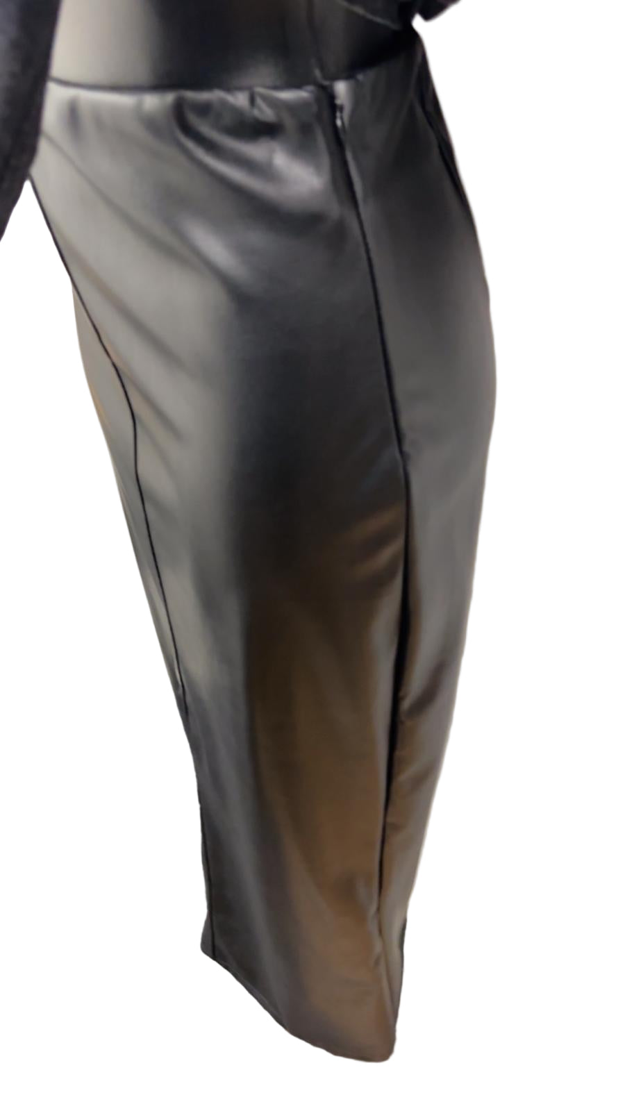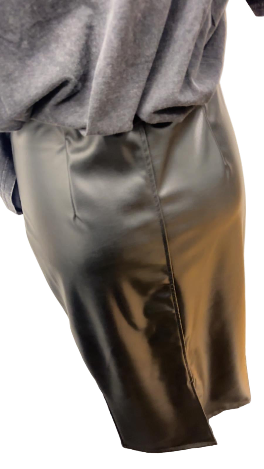 Questa gonna a matita in ecopelle combina un design raffinato con materiali di alta qualità, garantendo un look sofisticato e moderno. Dotata di una zip laterale funzionale, assicura una vestibilità perfetta e praticità d’uso. Ideale per chi cerca un capo versatile che unisca stile e comfort con un tocco contemporaneo.