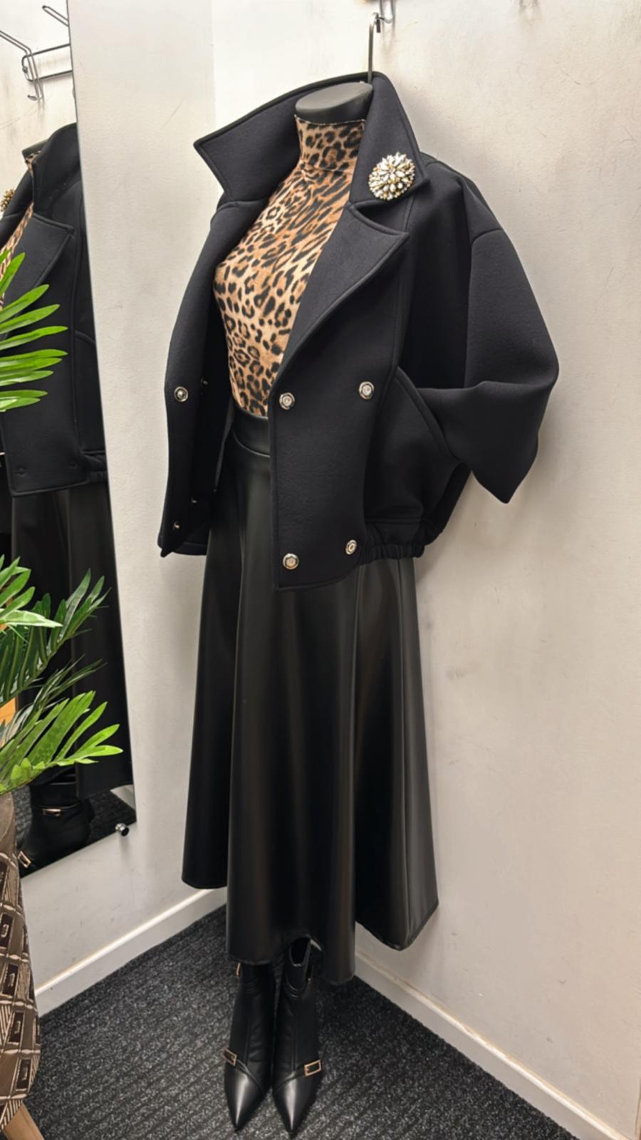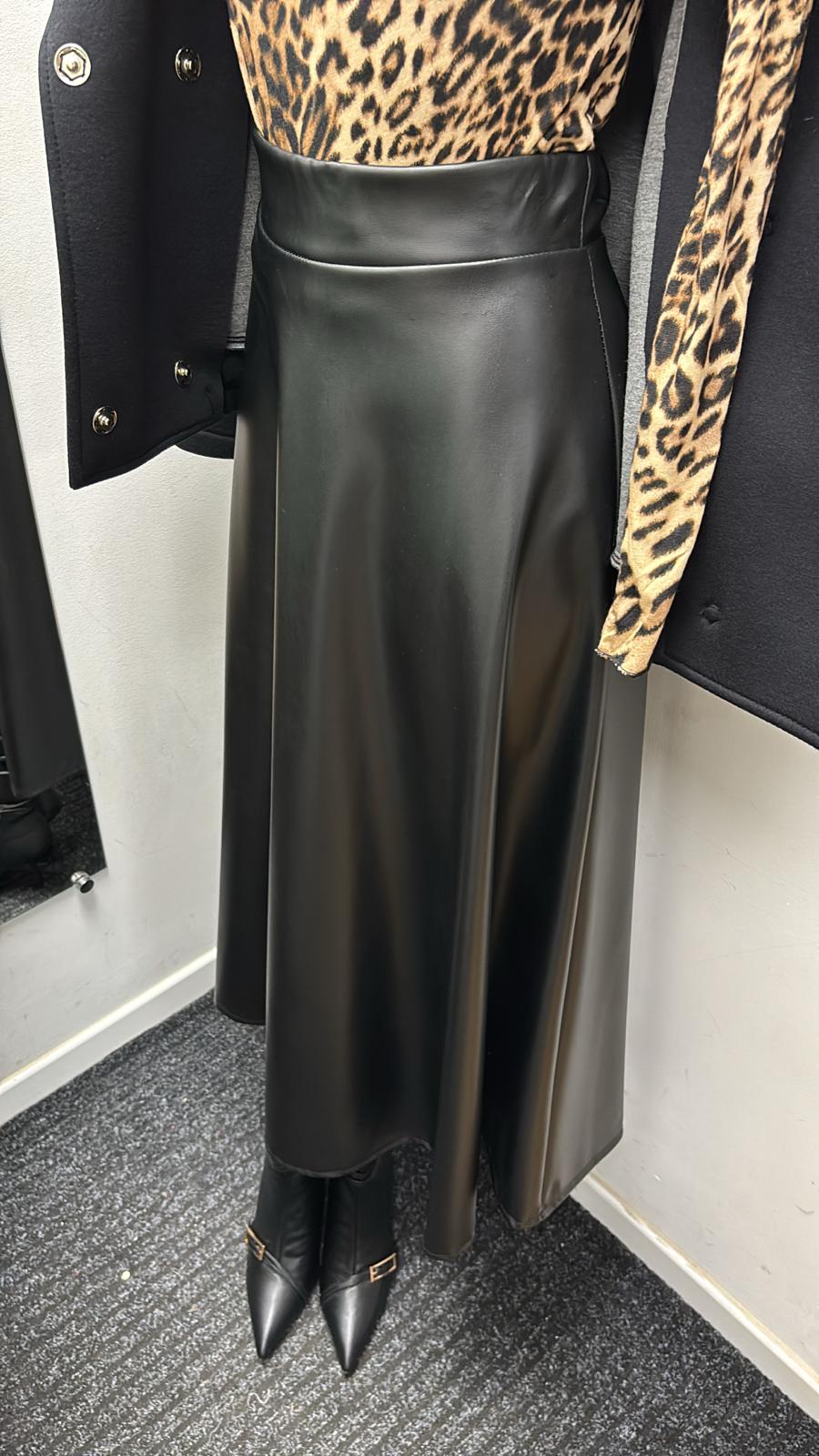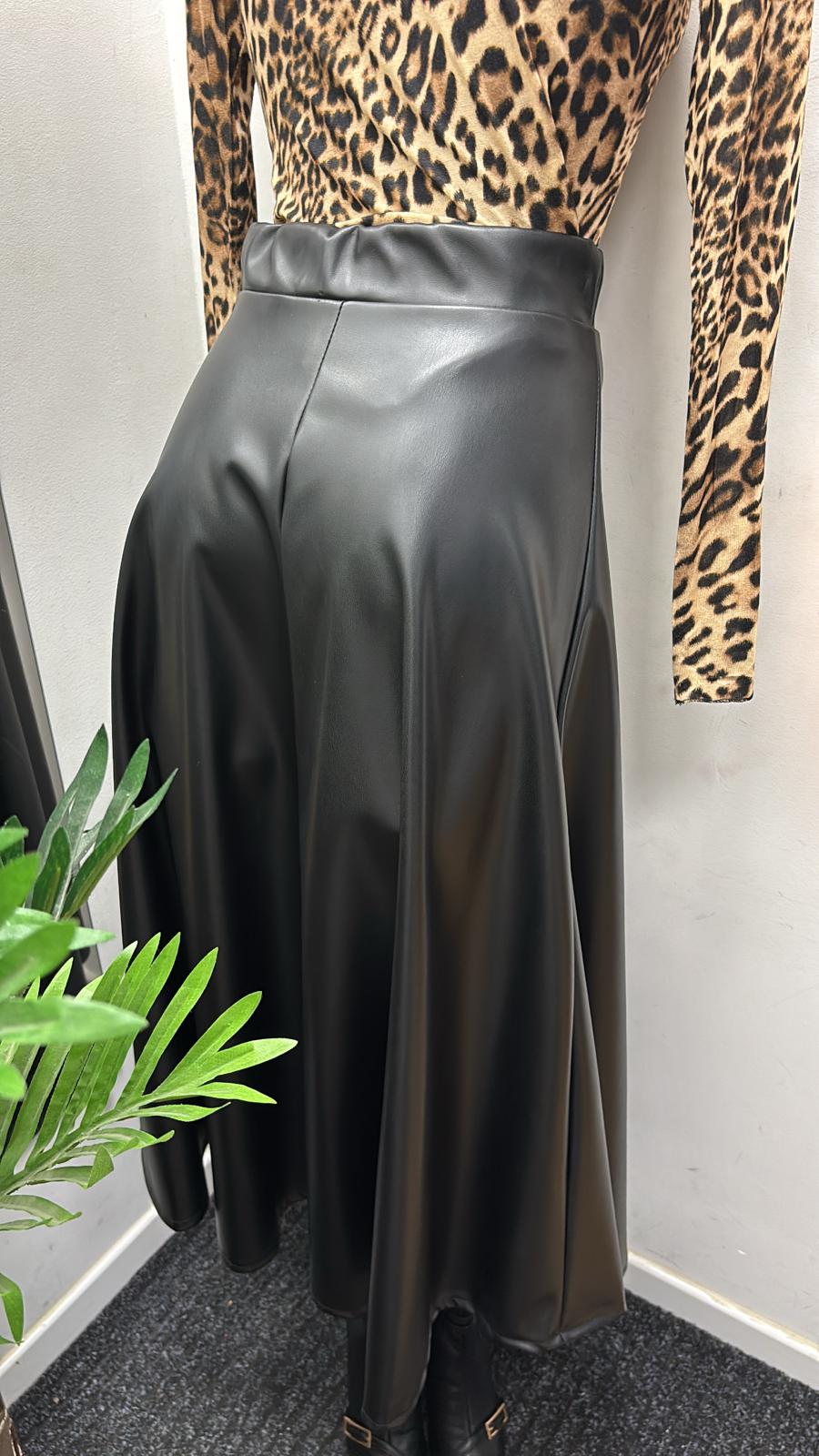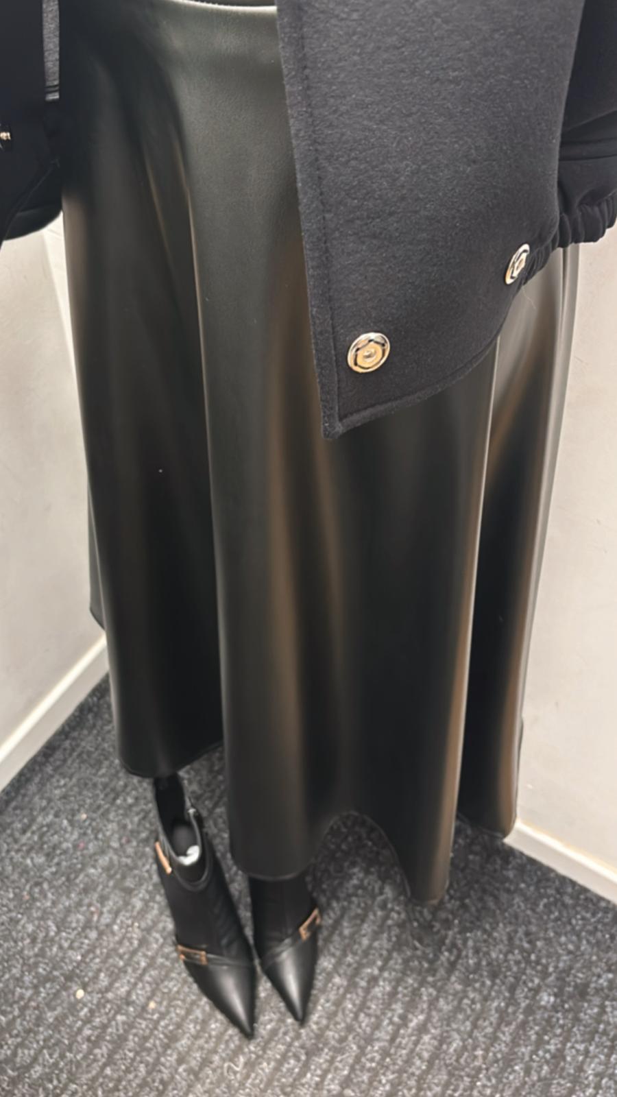 Questa gonna in eco pelle a ruota ampia unisce stile e praticità grazie al tessuto ecologico di alta qualità. L'elastico piatto in vita garantisce una vestibilità perfetta senza creare volume sulla pancia, assicurando comfort e un effetto snellente. Ideale per chi cerca un capo elegante ma comodo, perfetto da abbinare sia in occasioni casual che più formali.
