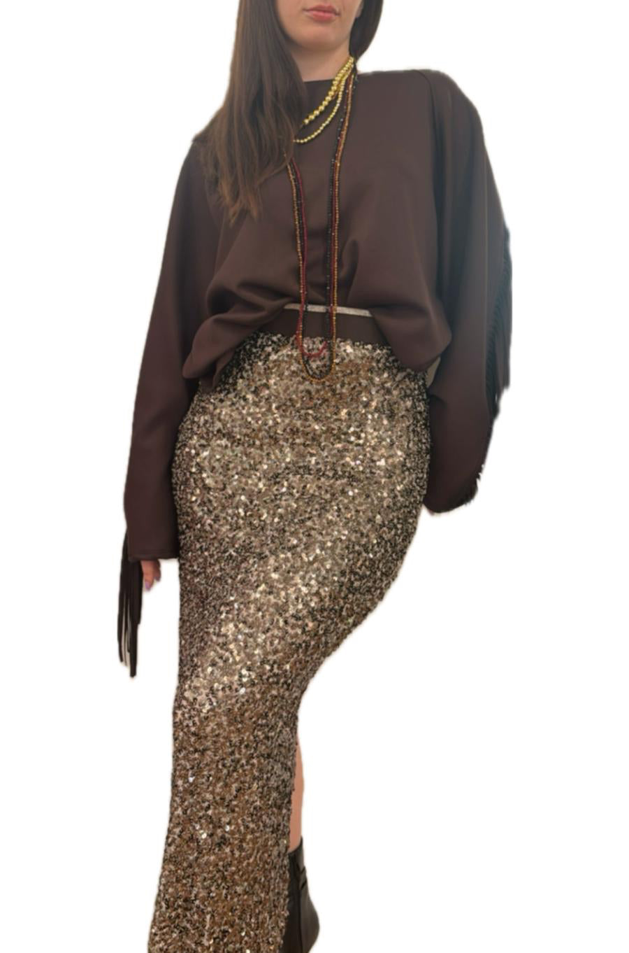 Questa gonna elasticizzata in paillettes unisce comfort e stile sofisticato. Il tessuto aderente valorizza la silhouette mentre lo spacco posteriore garantisce libertà di movimento e un tocco di eleganza sensuale. Perfetta per serate glamour o eventi speciali, offre un look brillante e moderno senza rinunciare alla praticità