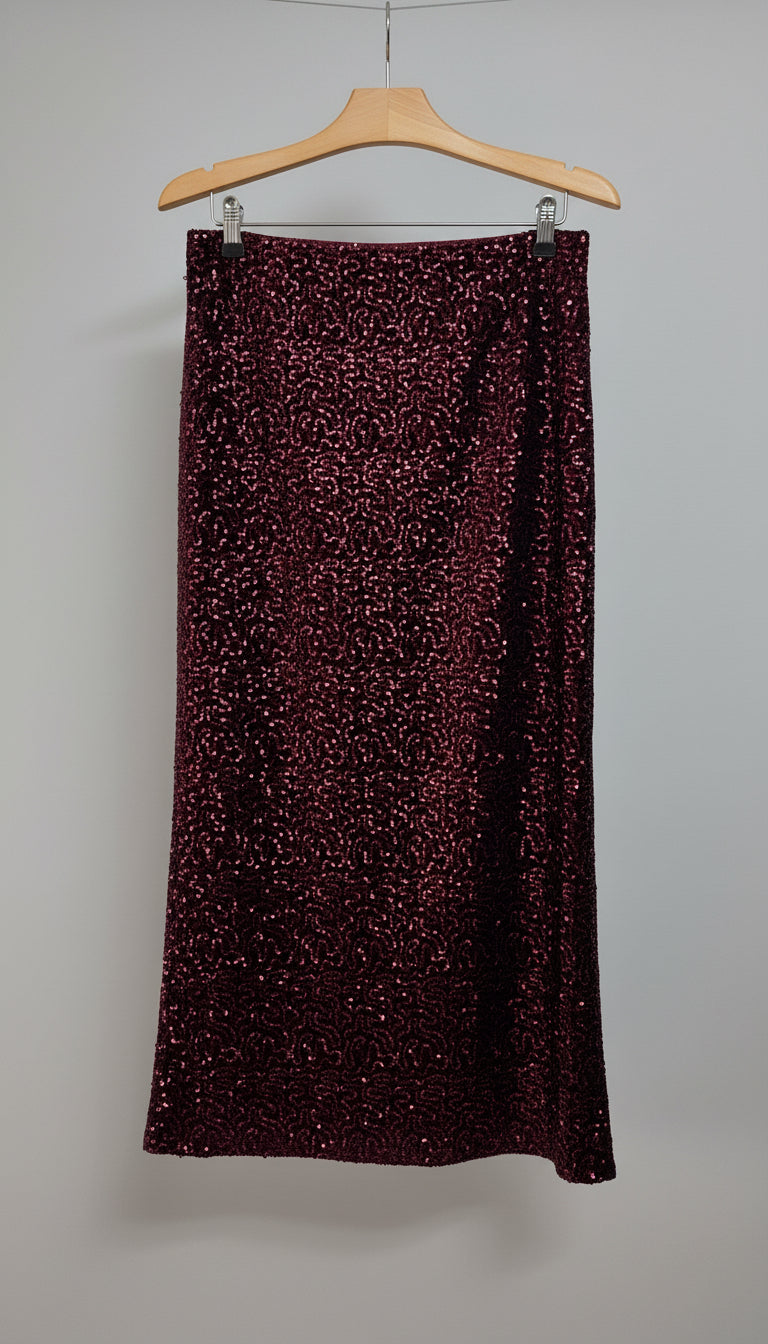 Gonna longuette in velluto morbido impreziosita da paillettes scintillanti che catturano la luce ad ogni movimento. La cintura elasticizzata garantisce una vestibilità confortevole e sicura, mentre lo spacco posteriore aggiunge eleganza e libertà di movimento. Un capo versatile perfetto per serate speciali, cene eleganti o quando desideri un tocco di glamour sofisticato al tuo look. Il velluto avvolge delicatamente le forme, regalando un effetto lussuoso e raffinato che non passa inosservato.