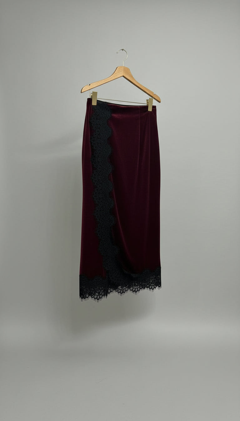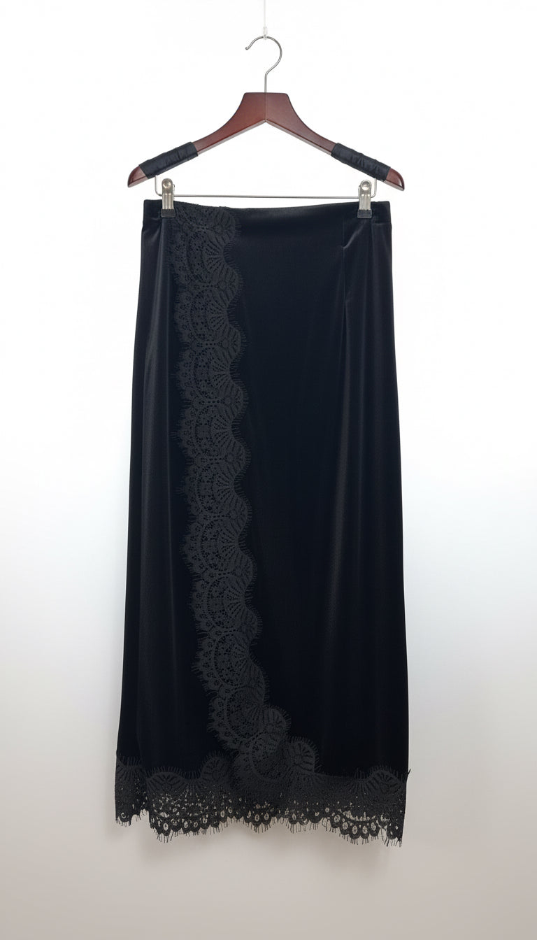 Gonna longuette in velluto con pizzo, realizzata con tessuto elasticizzato che garantisce comfort e libertà di movimento. Il velluto morbido e lussuoso si abbina perfettamente ai dettagli in pizzo, creando un capo elegante e sofisticato. Ideale per occasioni speciali o per chi desidera un tocco di classe nel proprio guardaroba. La vestibilità aderente valorizza la silhouette, mentre l'elasticità assicura comodità durante tutto il giorno.