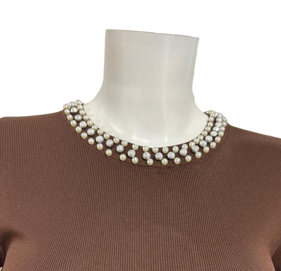 Questa maglia in filo presenta un elegante girocollo impreziosito da perle e strass applicati con borchiette, offrendo un dettaglio luminoso senza cuciture visibili. La lavorazione raffinata valorizza ogni outfit con un tocco sofisticato e moderno.