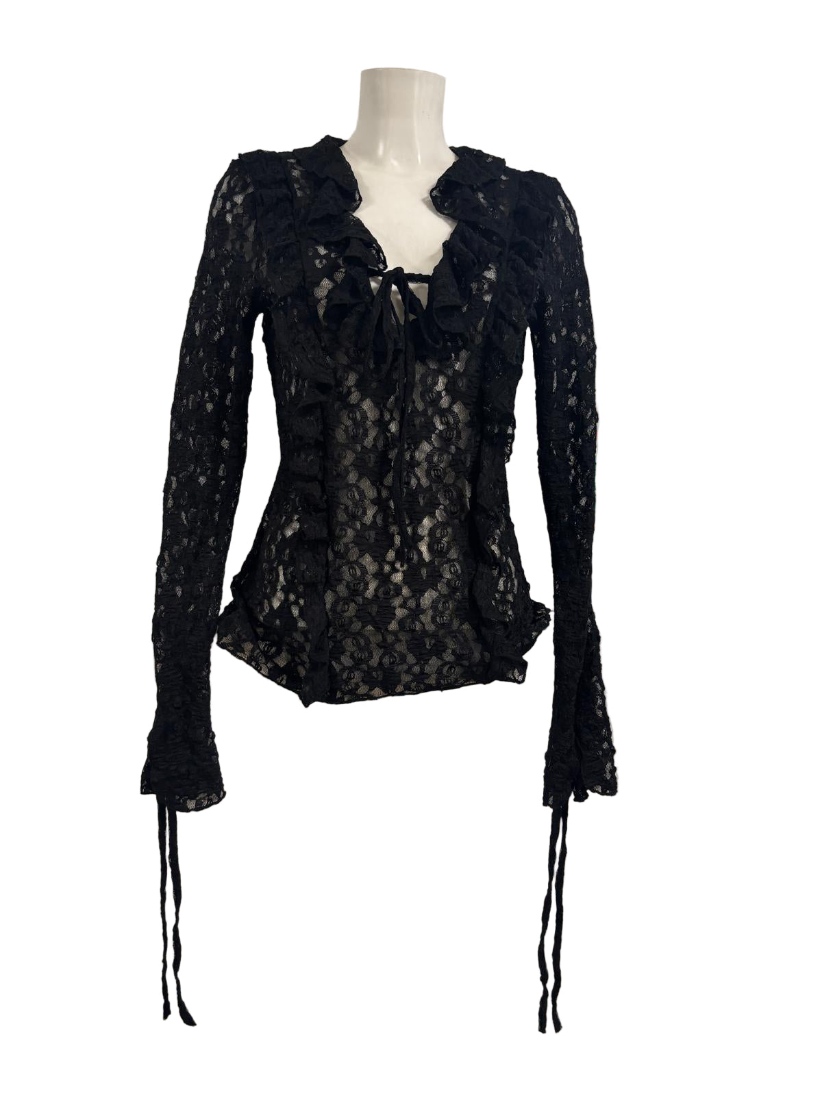 Questa maglia in pizzo a manica lunga unisce eleganza e comfort grazie al tessuto morbidissimo e completamente trasparente. Dotata di coulisse regolabili su collo e polsi, permette una vestibilità personalizzata e raffinata, ideale per chi cerca un capo versatile e di grande stile.