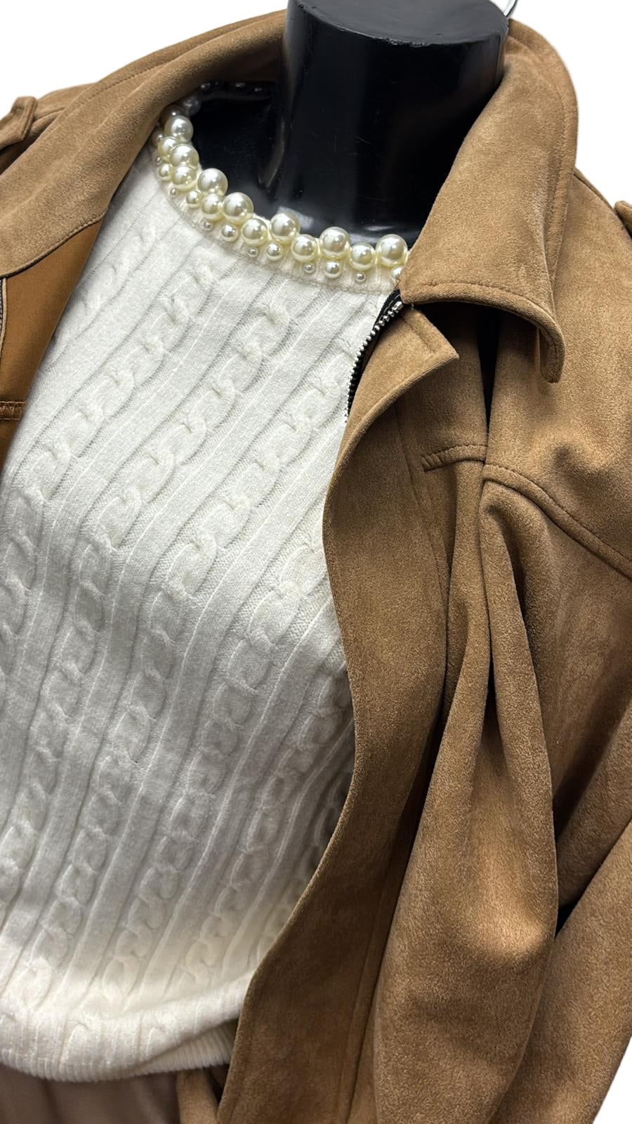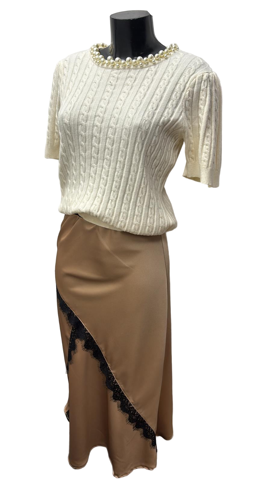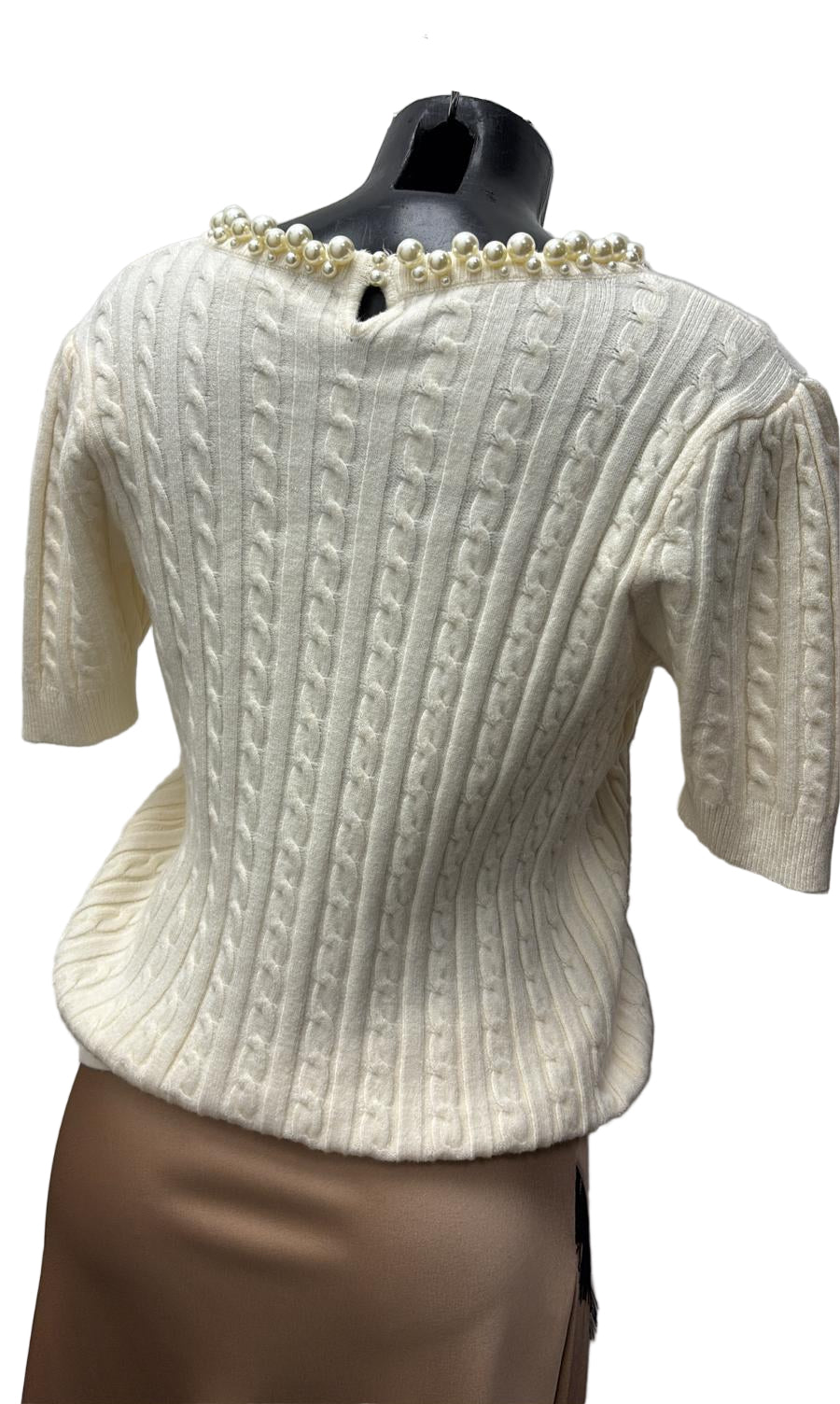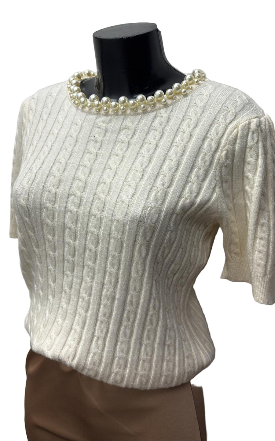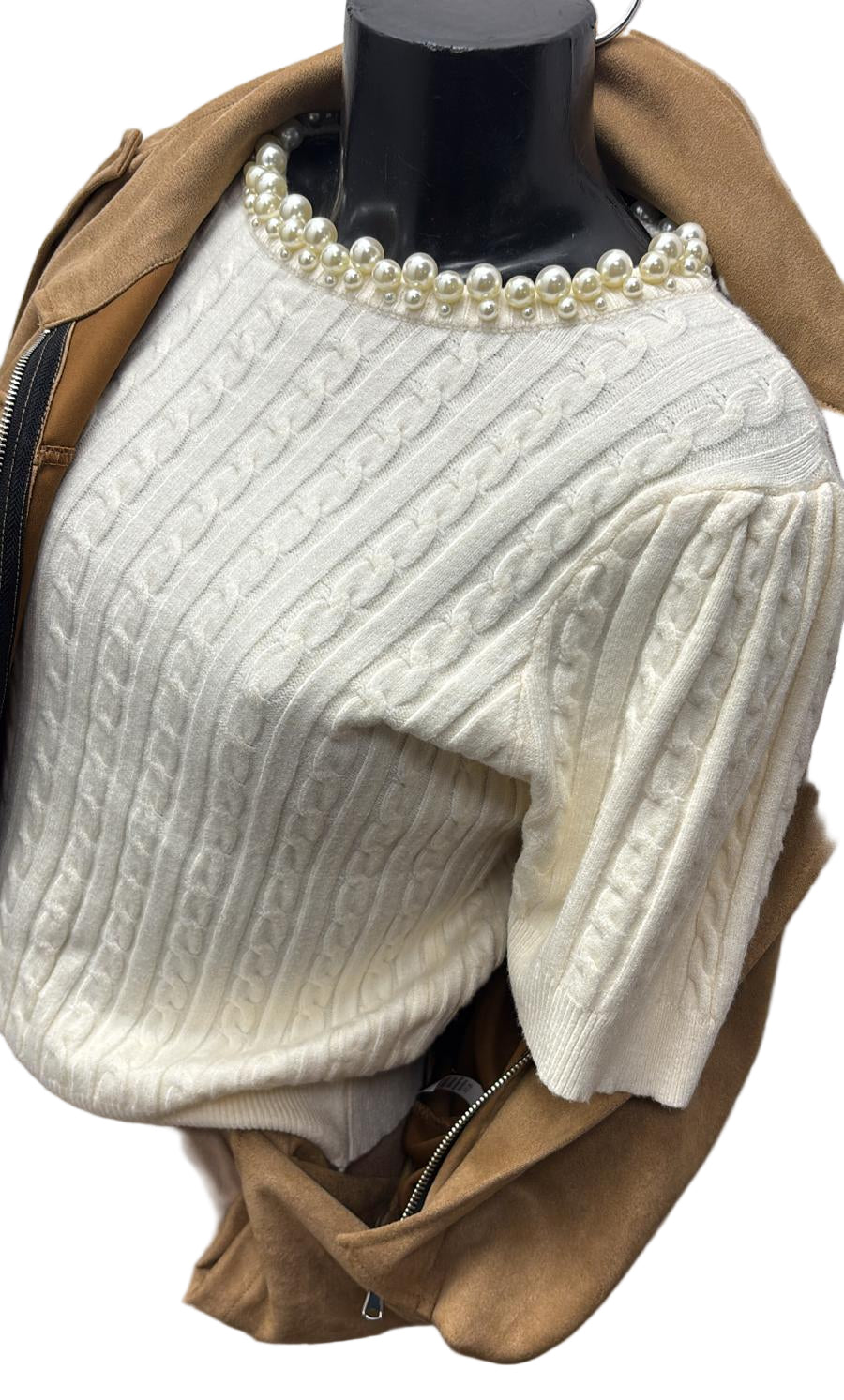 Questo maglioncino a manica corta intrecciato in viscosa unisce eleganza e comfort. La morbida viscosa garantisce una piacevole vestibilità, mentre il dettaglio di perle sul girocollo aggiunge un tocco raffinato e distintivo, ideale per valorizzare qualsiasi outfit con sobrietà e stile. Perfetto per occasioni formali o per elevare il look quotidiano.