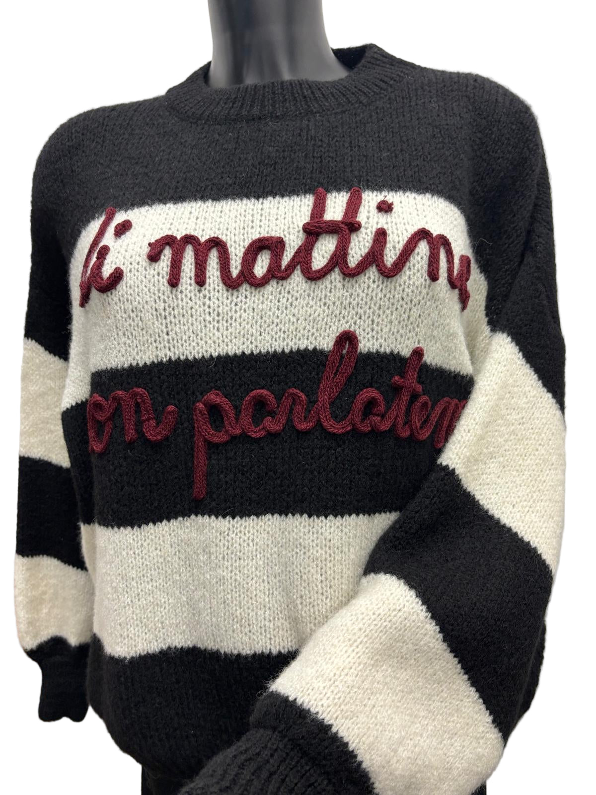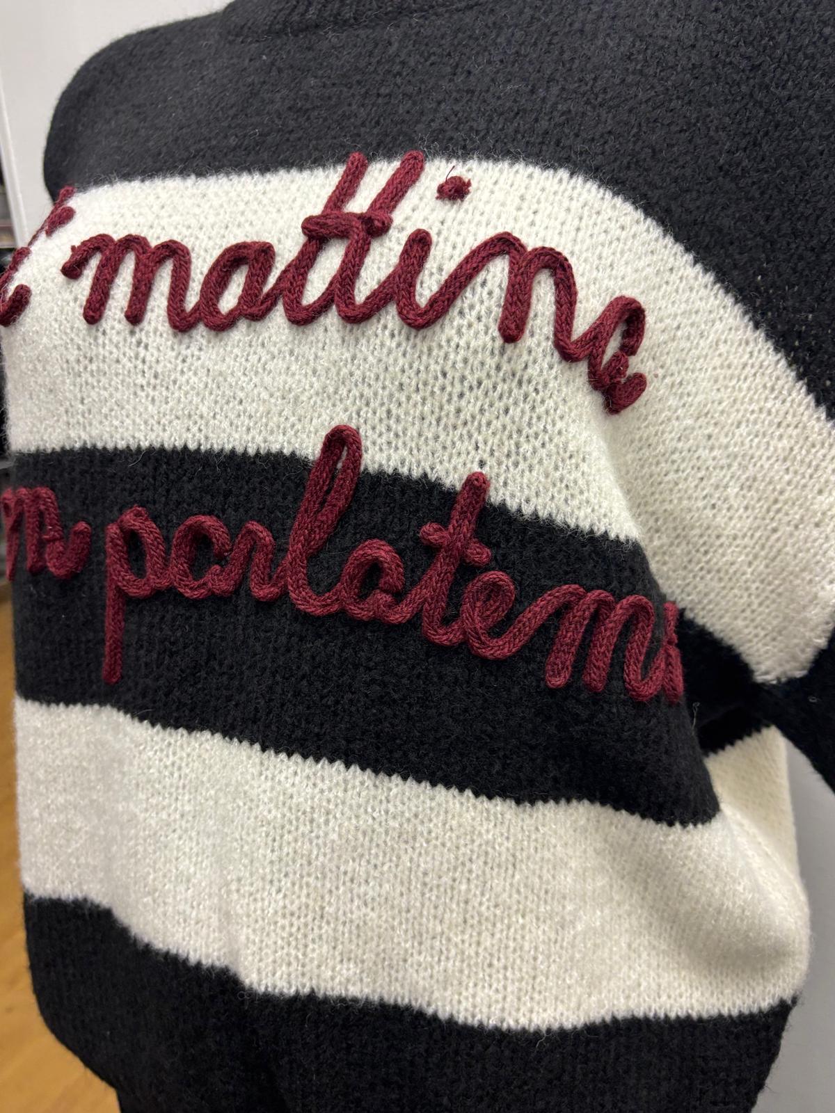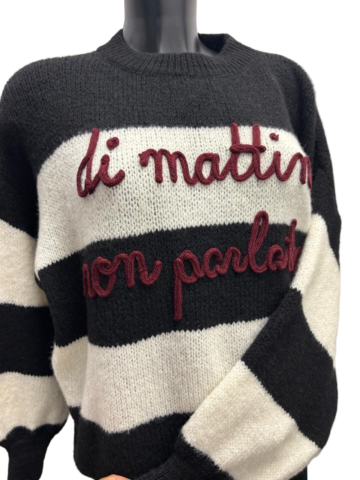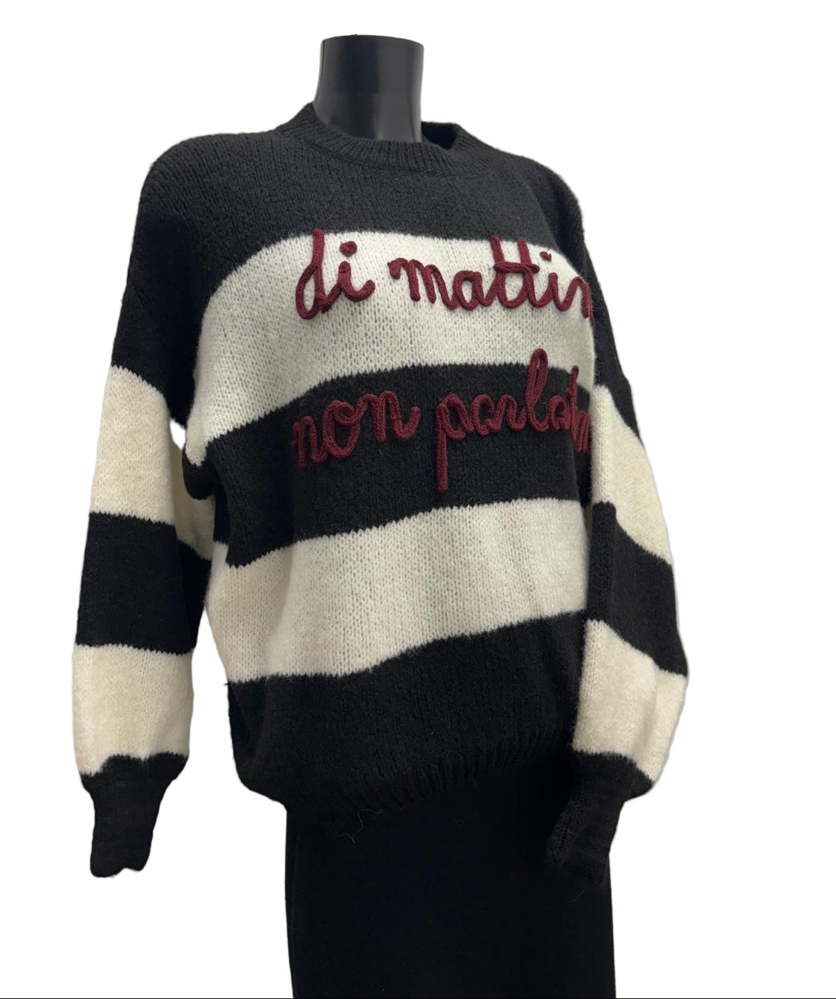 Questo maglioncino con ricamo “di mattina non parlatemi” unisce comfort e stile con un tocco di ironia. Realizzato con materiali di qualità, offre una vestibilità comoda e adatta a ogni occasione casual. Il ricamo delicato aggiunge personalità senza rinunciare a eleganza e sobrietà, rendendo questo capo perfetto per chi desidera esprimere il proprio mood in modo raffinato.