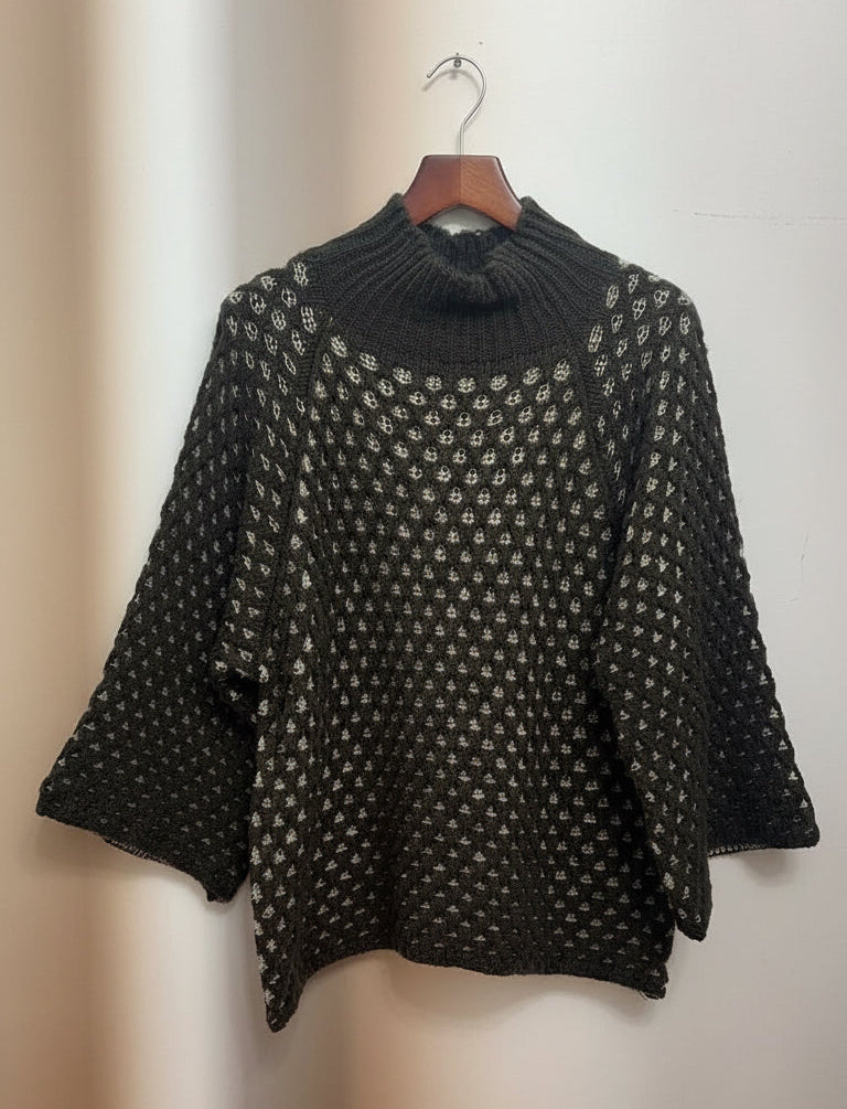 Maglioncino con trama nido d'ape che regala texture e movimento. Le maniche a campana creano una silhouette elegante e femminile, mentre la vestibilità a scatoletta garantisce comfort senza rinunciare alla definizione. Perfetto per layering sofisticato o indossato da solo, questo pezzo essenziale eleva qualsiasi guardaroba con semplicità raffinata e versatilità senza tempo.
