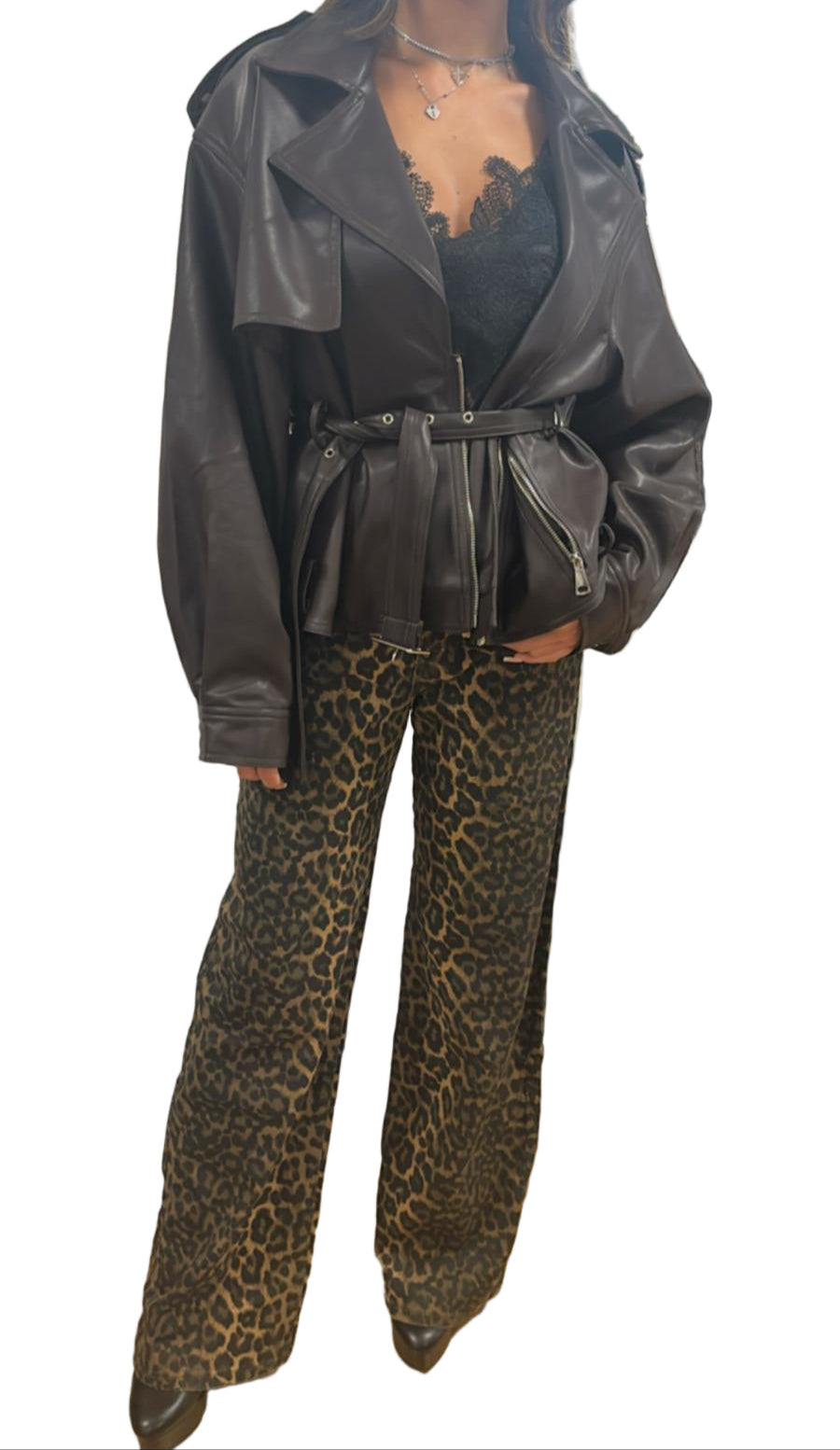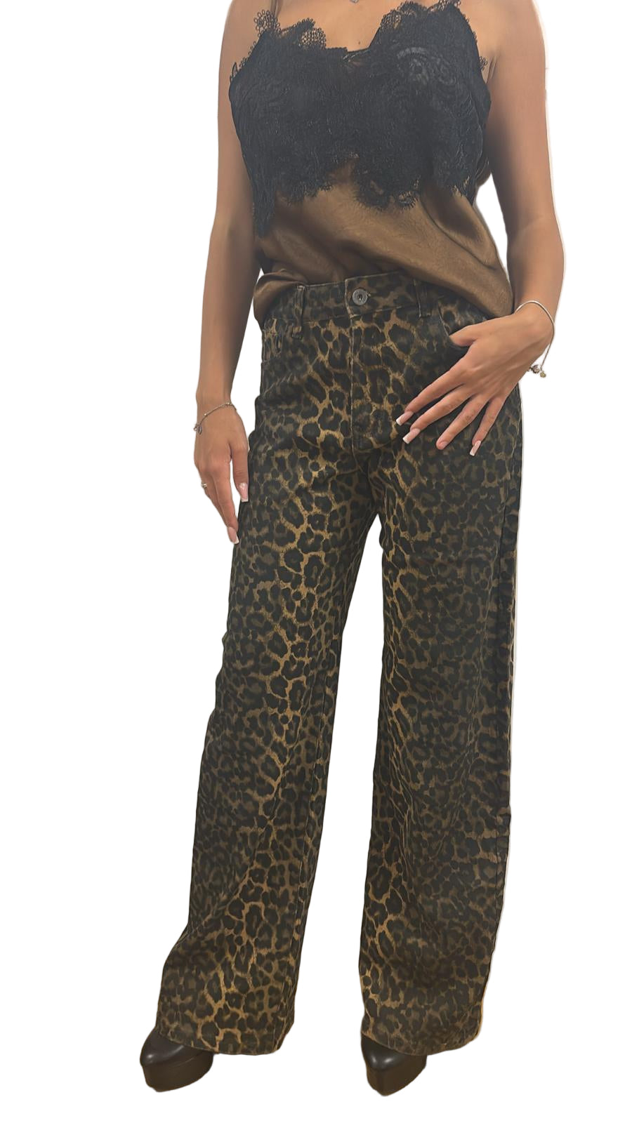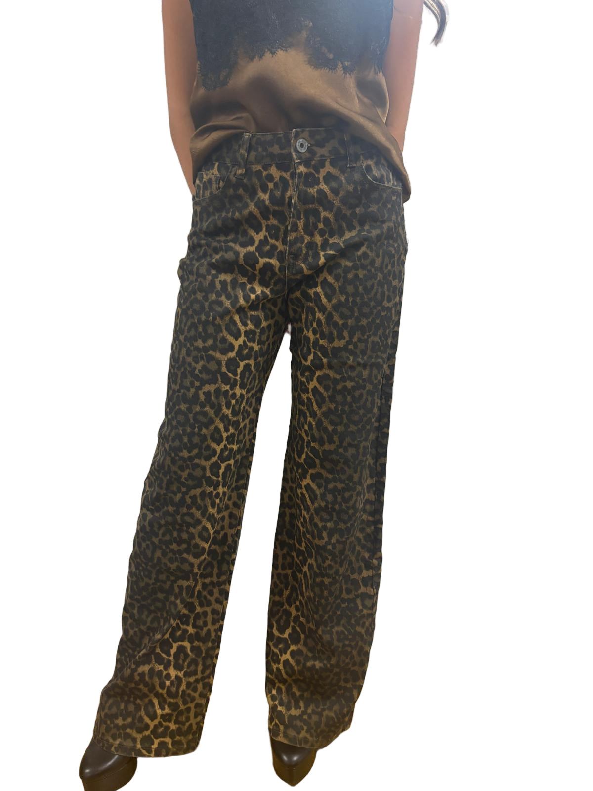 Questi pantaloni modello dritto offrono un comfort superiore grazie al tessuto elasticizzato che si adatta perfettamente al corpo, mentre la gamba leggermente a palazzo garantisce una vestibilità elegante e moderna. La stampa maculata aggiunge un tocco distintivo e di tendenza, ideale per chi desidera un capo versatile e di carattere da indossare in diverse occasioni. Perfetti per chi cerca stile e praticità senza rinunciare alla qualità.