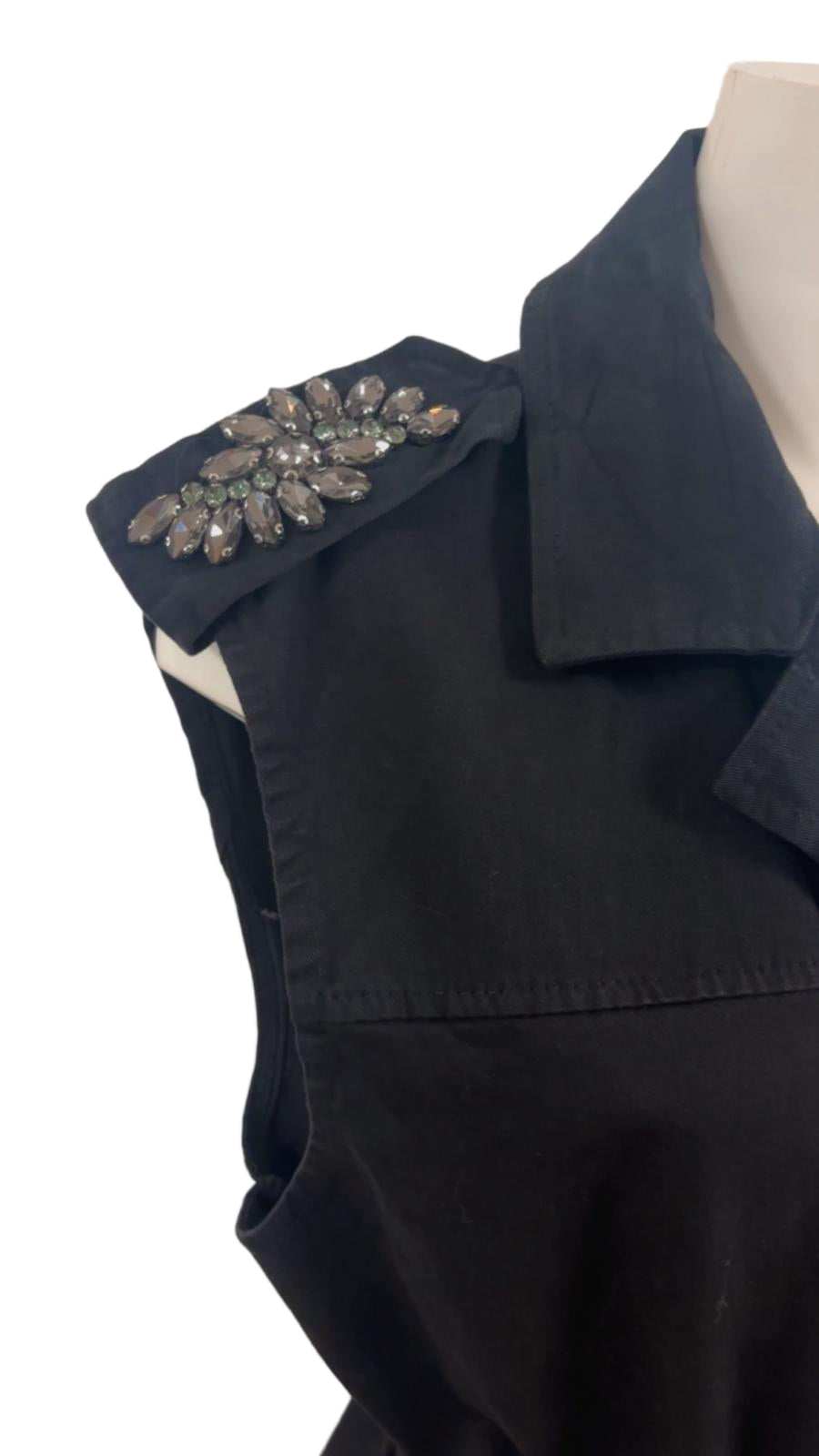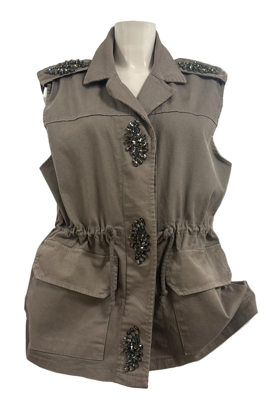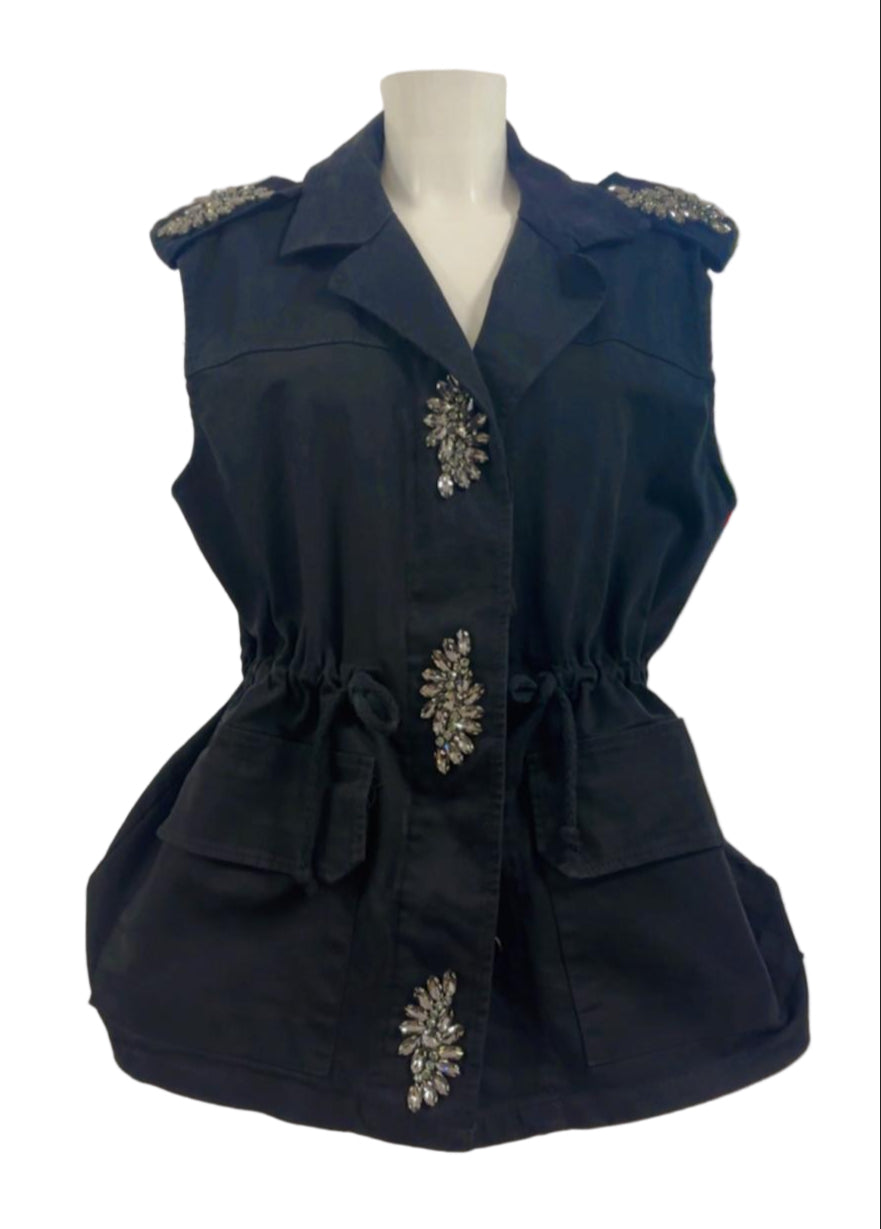 Questa sahariana in cotone smanicata unisce praticità e stile con la sua silhouette versatile. La coulisse in vita permette una regolazione personalizzata, valorizzando la figura, mentre le delicate applicazioni in strass aggiungono un tocco di raffinatezza senza rinunciare alla funzionalità. Ideale per un look sofisticato ma comodo durante le mezze stagioni.