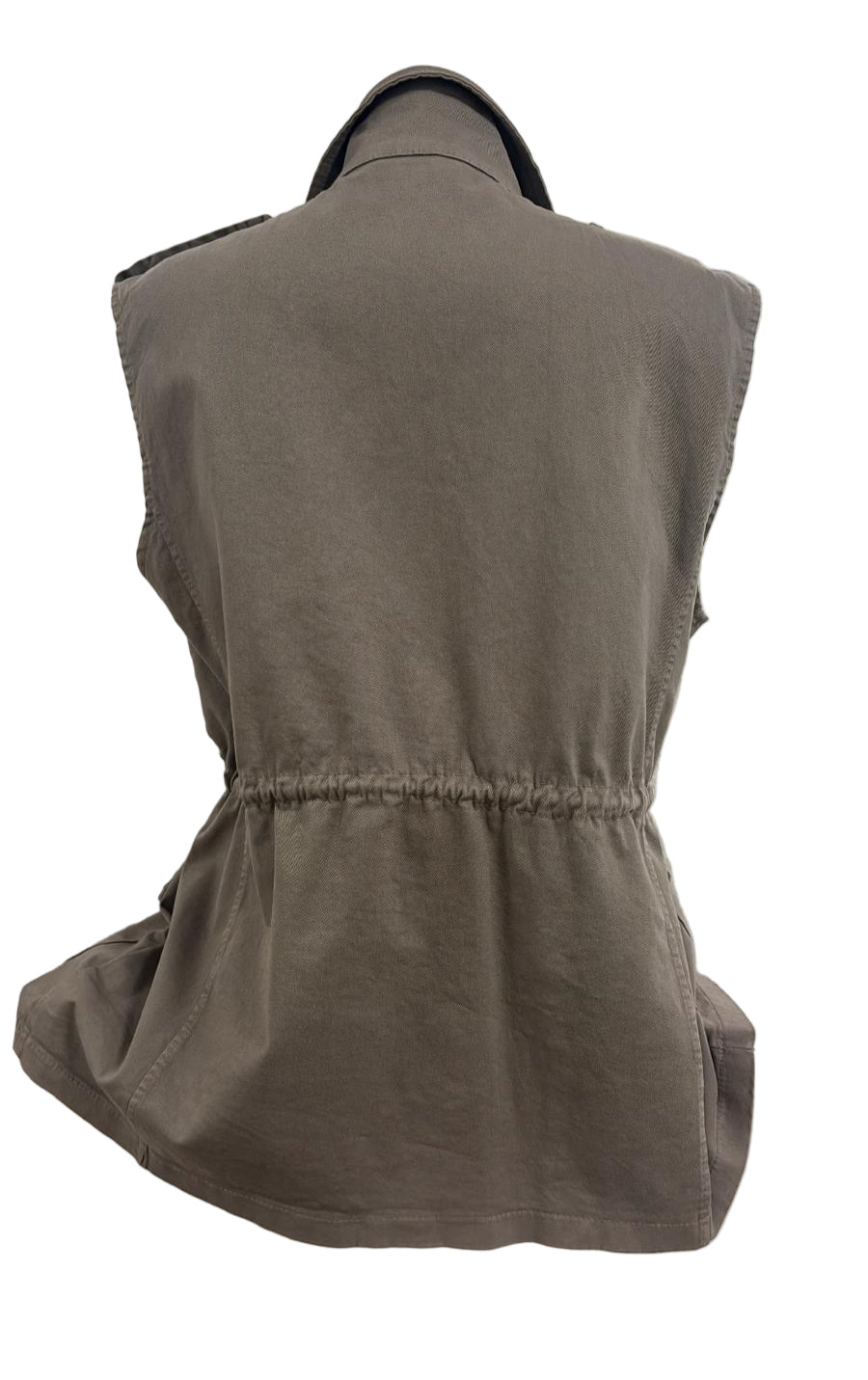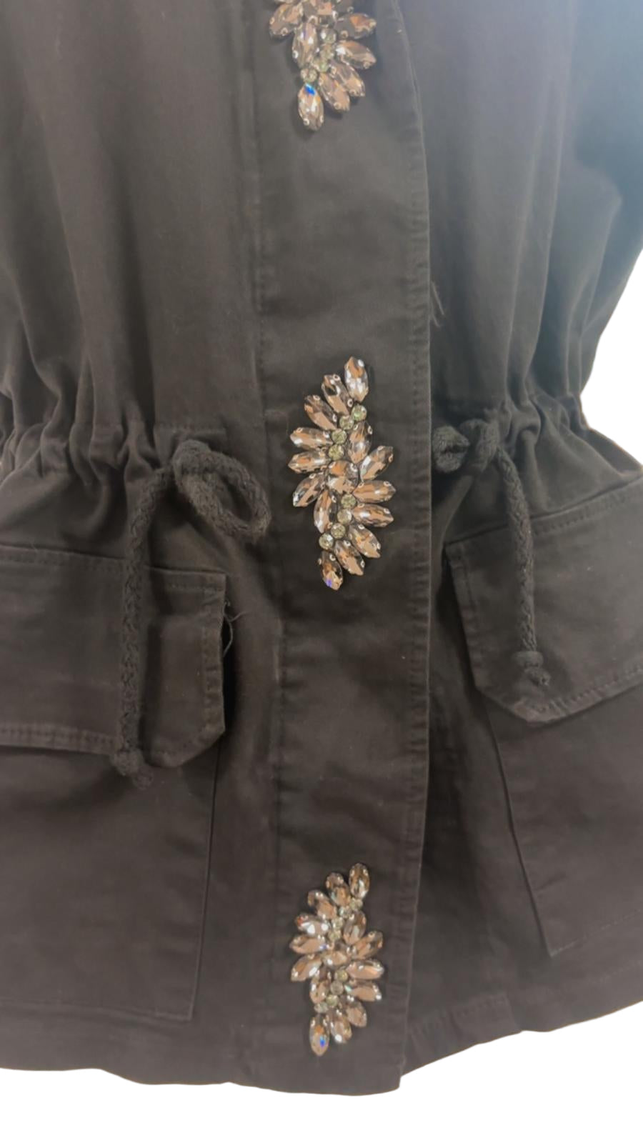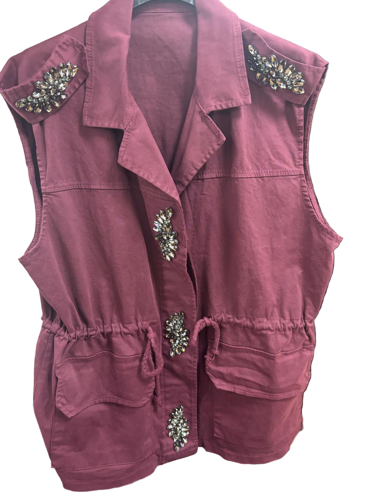 Questa sahariana in cotone smanicata unisce praticità e stile con la sua silhouette versatile. La coulisse in vita permette una regolazione personalizzata, valorizzando la figura, mentre le delicate applicazioni in strass aggiungono un tocco di raffinatezza senza rinunciare alla funzionalità. Ideale per un look sofisticato ma comodo durante le mezze stagioni.
